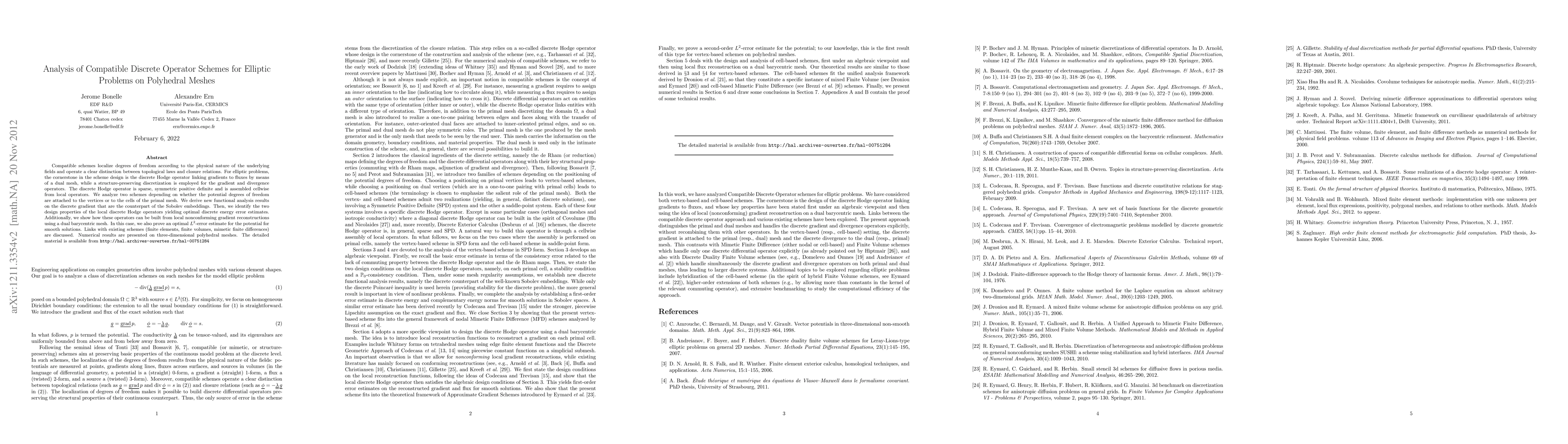 This paper analyzes compatible discrete operator schemes for elliptic problems on polyhedral meshes, focusing on the discrete Hodge operator linking gradients to fluxes. It derives optimal energy error estimates and $L^2$-error estimates for potentials, and discusses links to existing finite element, finite volume, and mimetic finite difference methods, supported by numerical results on 3D meshes.