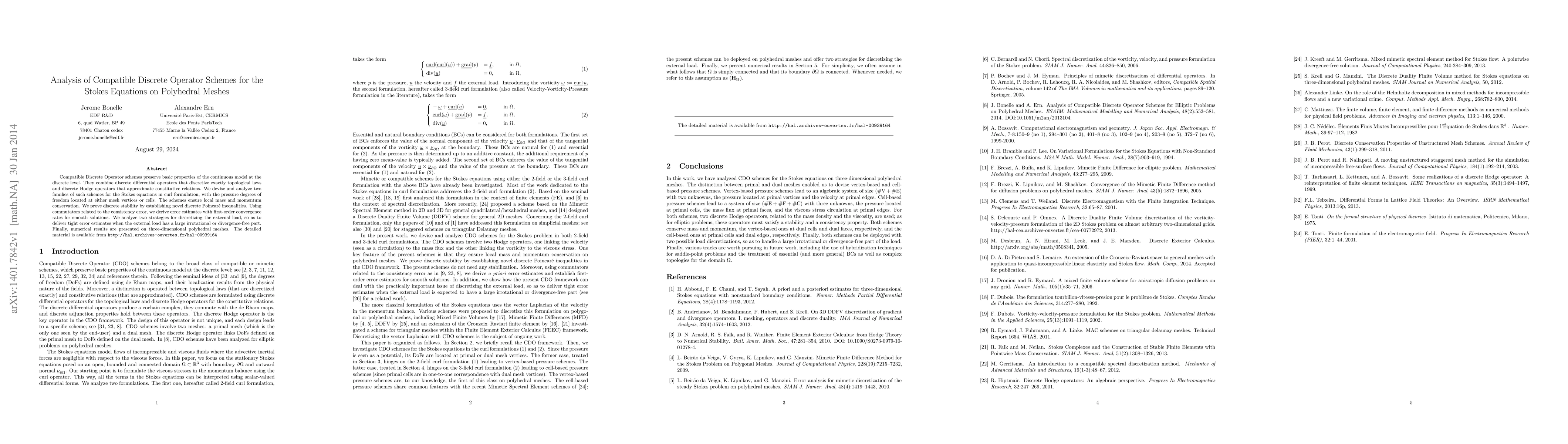 This paper develops and analyzes two families of compatible discrete operator schemes for the Stokes equations on polyhedral meshes, ensuring local conservation and proving stability through novel inequalities. It provides first-order error estimates and strategies for handling external loads, with numerical validation on 3D meshes.