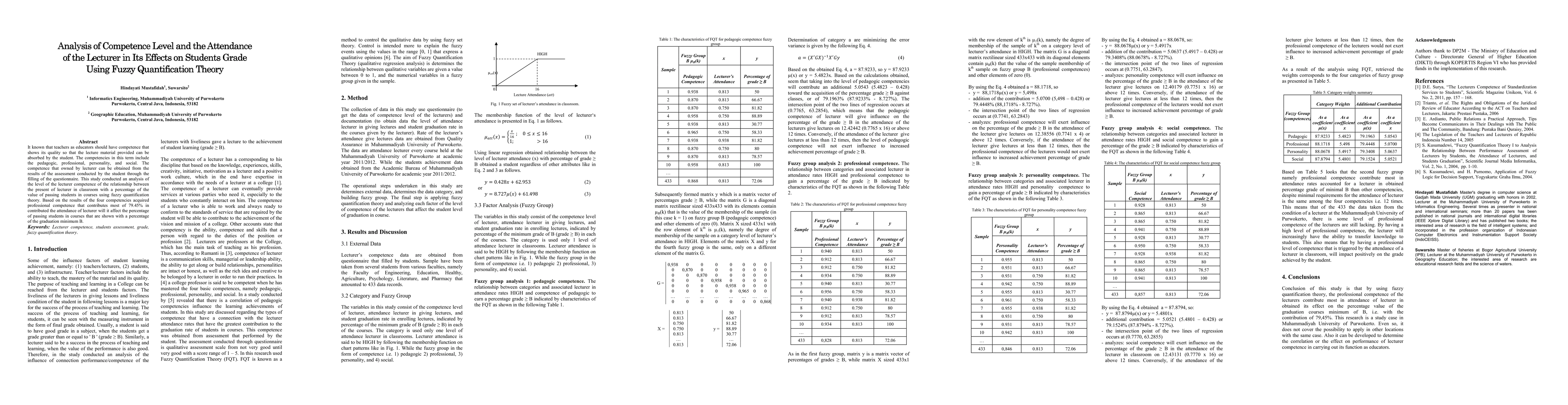 It known that teachers as educators should have competence that shows its quality so that the lecture material provided can be absorbed by the student. The competencies in this term include the pedagogic, professional, personality, and social. The competence that owned by lecturer can be obtained from the results of the assessment conducted by the student through the filling of the questionnaire. This study conducted an analysis of the level of the lecturer competence of the relationship between the present of lecturer in classroom with a percentage of the value of passing students in courses using fuzzy quantification theory. Based on the results of the four competencies acquired professional competence that contributes most of 79.45% in contributed the attendance of lecturer will it affect the percentage of passing students in courses that are shown with a percentage of the graduation minimum B.