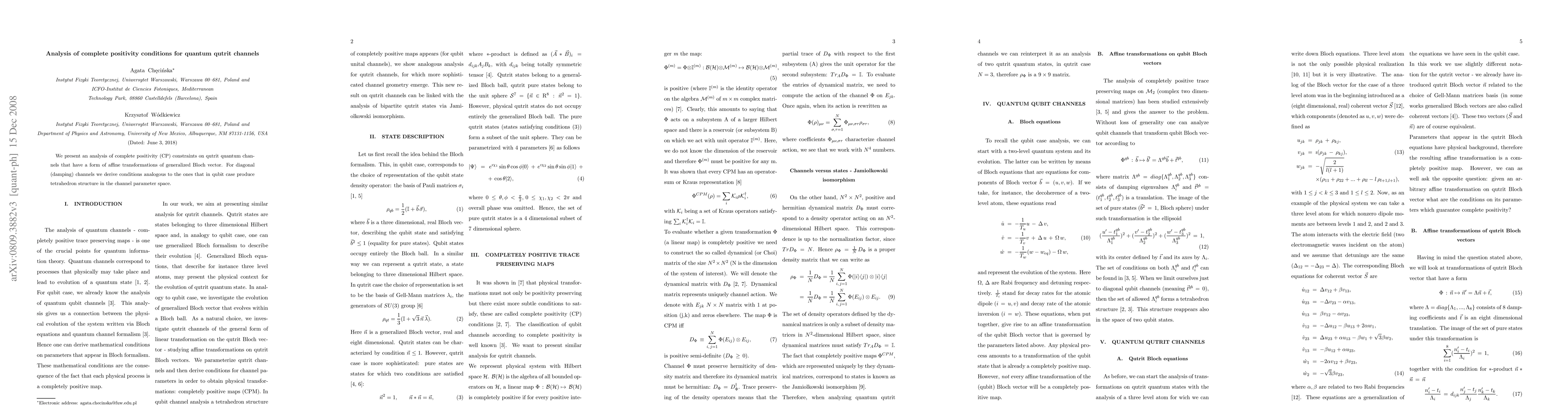 This paper analyzes complete positivity constraints for quantum qutrit channels, focusing on affine transformations of generalized Bloch vectors. It derives conditions for diagonal (damping) channels analogous to those producing a tetrahedron structure in qubit channel parameter space.