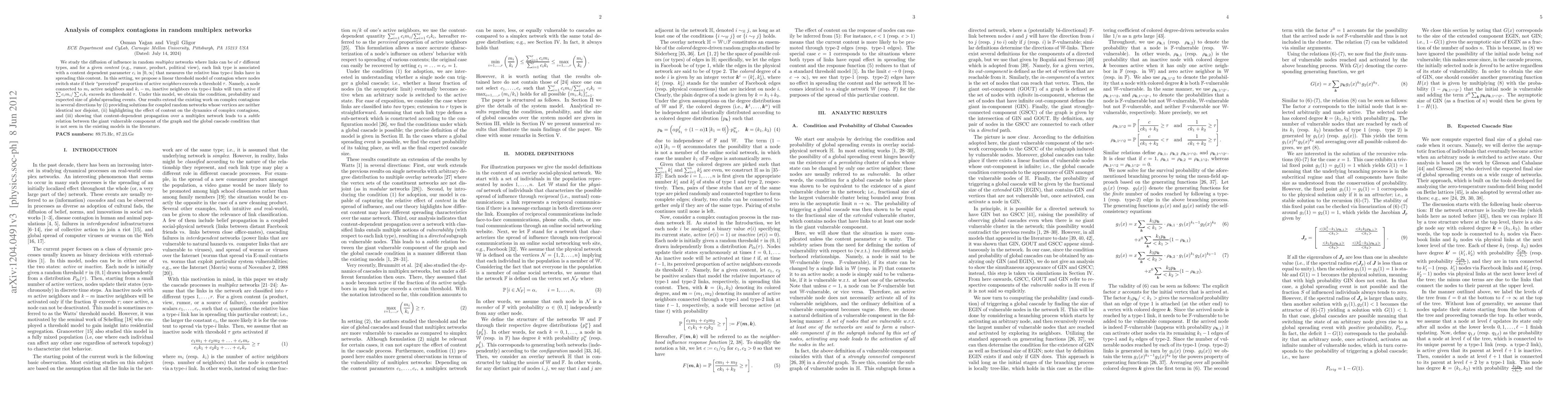 This paper analyzes the diffusion of influence in random multiplex networks with multiple link types, proposing a linear threshold model for complex contagions. It identifies conditions for global spreading events, highlighting the impact of content and the nuanced relationship between network structure and contagion dynamics.