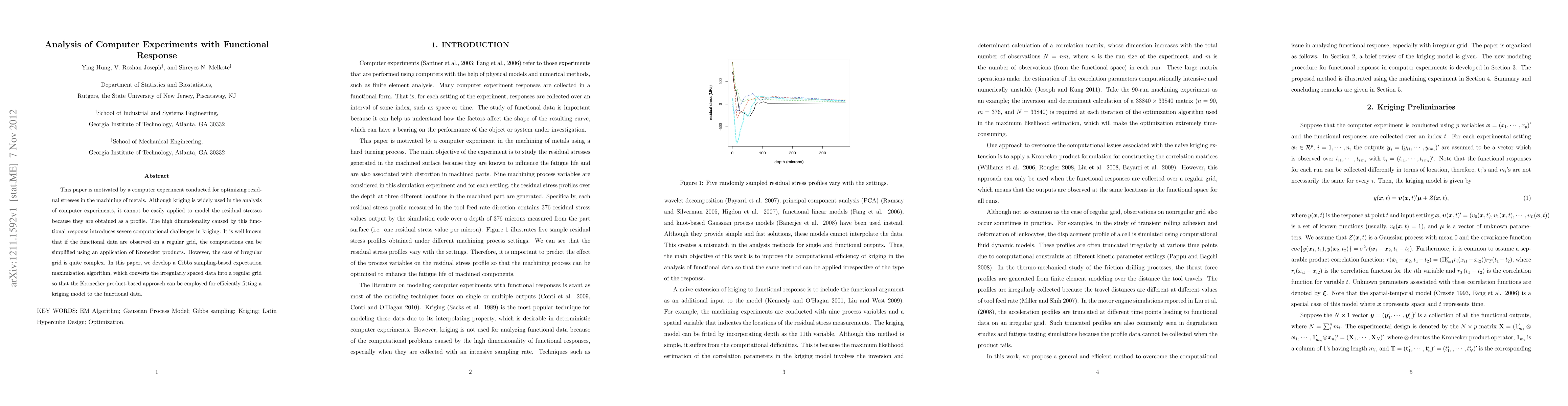 This paper is motivated by a computer experiment conducted for optimizing residual stresses in the machining of metals. Although kriging is widely used in the analysis of computer experiments, it cannot be easily applied to model the residual stresses because they are obtained as a profile. The high dimensionality caused by this functional response introduces severe computational challenges in kriging. It is well known that if the functional data are observed on a regular grid, the computations can be simplified using an application of Kronecker products. However, the case of irregular grid is quite complex. In this paper, we develop a Gibbs sampling-based expectation maximization algorithm, which converts the irregularly spaced data into a regular grid so that the Kronecker product-based approach can be employed for efficiently fitting a kriging model to the functional data.