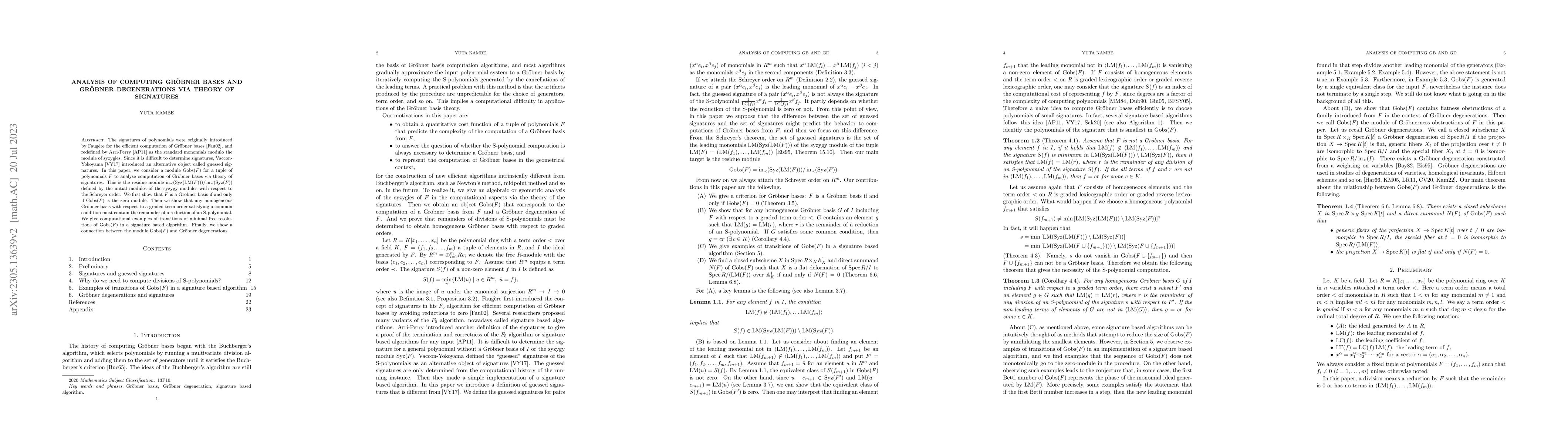 This paper analyzes the computation of Gröbner bases using the theory of signatures, showing that a set of polynomials forms a Gröbner basis if the associated module $\mathrm{Gobs}(F)$ is zero. It also establishes that homogeneous Gröbner bases under specific conditions must contain the remainder of an S-polynomial reduction and demonstrates connections between $\mathrm{Gobs}(F)$ and Gröbner degenerations.