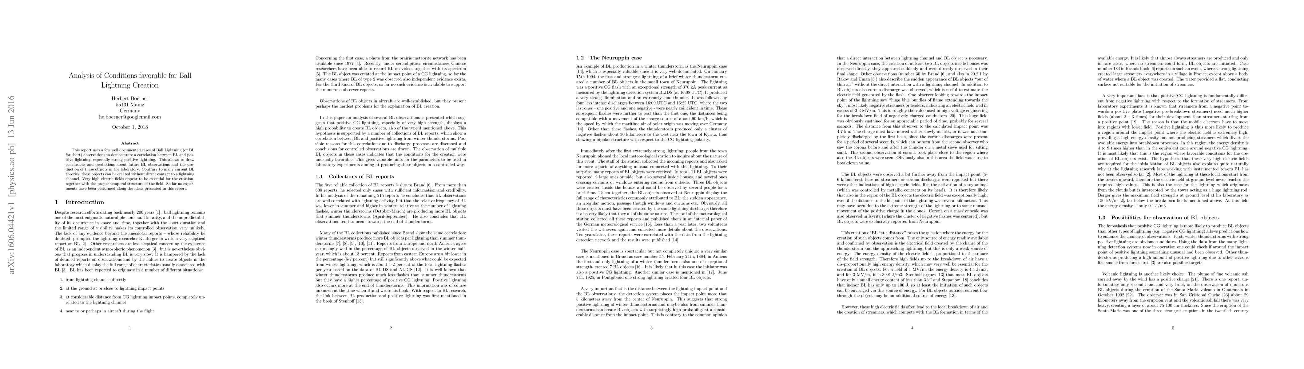 This report uses a few well documented cases of Ball Lightning (or BL for short) observations to demonstrate a correlation between BL and positive lightning, especially strong positive lightning. This allows to draw conclusions and predictions about future BL observations and the pro- duction of these objects in the laboratory. Contrary to many current BL theories, these objects can be created without direct contact to a lightning channel. Very high electric fields appear to be essential for the creation, together with the proper temporal structure of the field. So far no experiments have been performed along the ideas presented in this report.