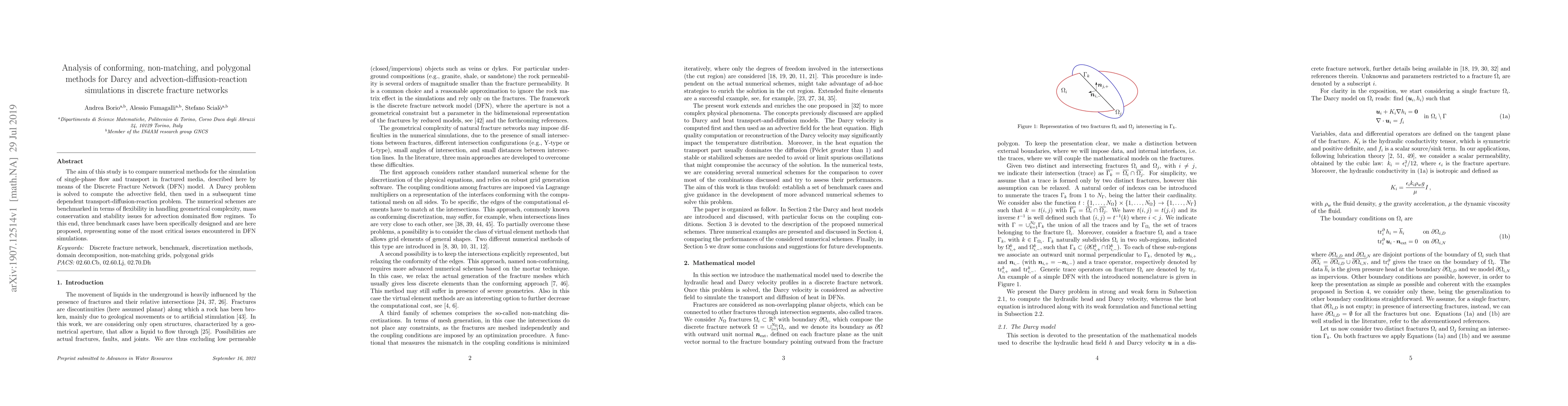 This research compares numerical methods for simulating fluid flow and transport in complex fractured rock formations using Discrete Fracture Network (DFN) models. It benchmarks conforming, non-matching, and polygonal methods for Darcy flow and advection-diffusion-reaction problems, focusing on geometrical flexibility, mass conservation, and stability in advection-dominated flows. Three benchmark cases are proposed to highlight critical issues in DFN simulations.