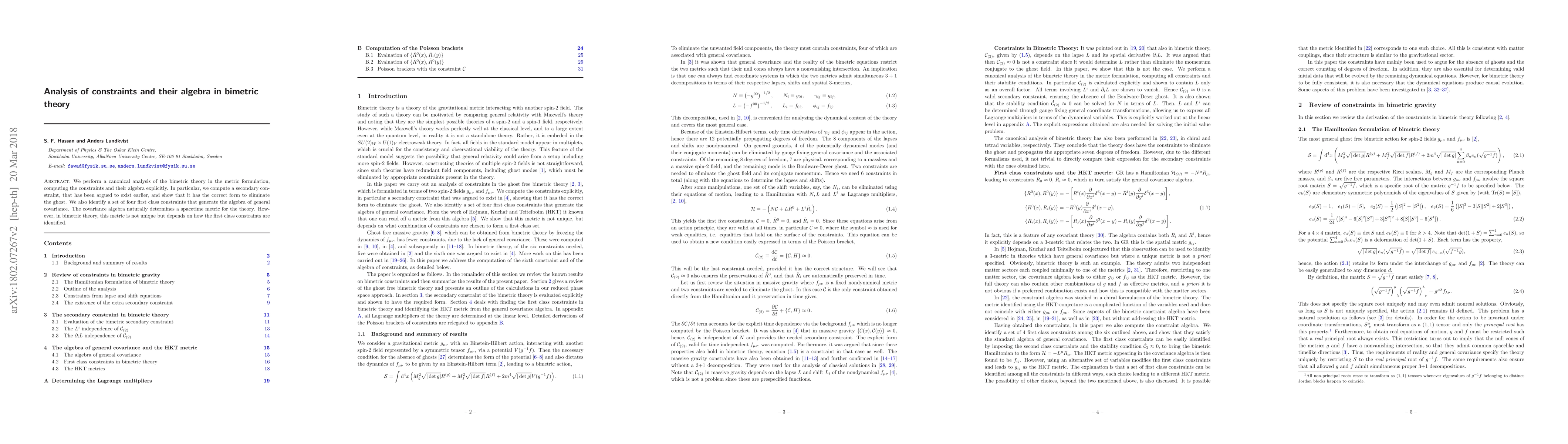 We perform a canonical analysis of the bimetric theory in the metric formulation, computing the constraints and their algebra explicitly. In particular, we compute a secondary constraint, that has been argued to exist earlier, and show that it has the correct form to eliminate the ghost. We also identify a set of four first class constraints that generate the algebra of general covariance. The covariance algebra naturally determines a spacetime metric for the theory. However, in bimetric theory, this metric is not unique but depends on how the first class constraints are identified.