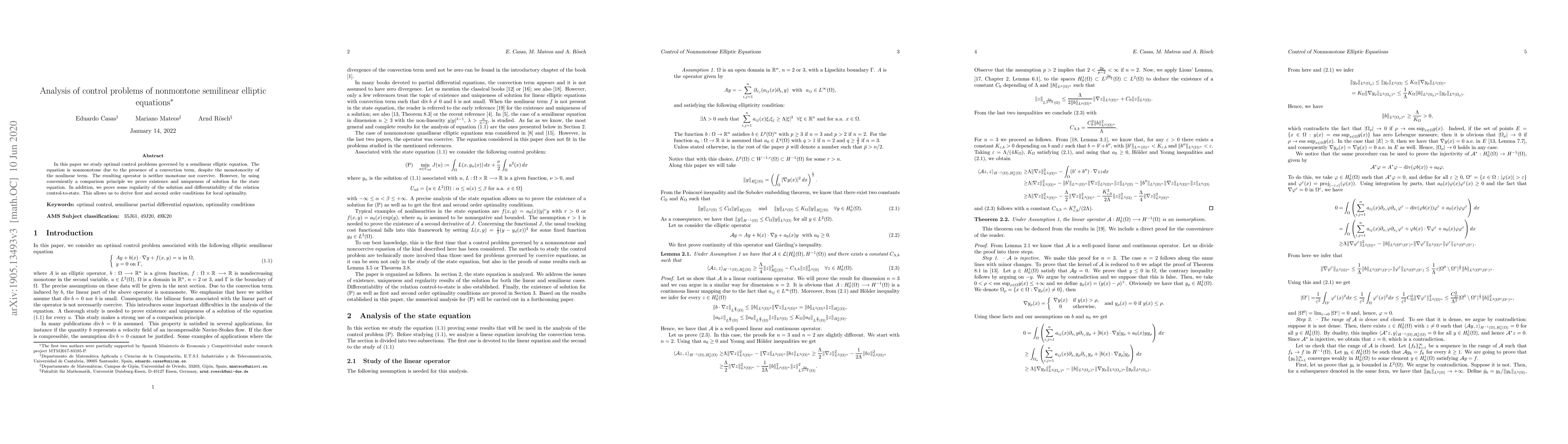 This research contributes to the understanding of control problems involving nonmonotone semilinear elliptic equations, which are important in various applications, including fluid dynamics and structural mechanics.