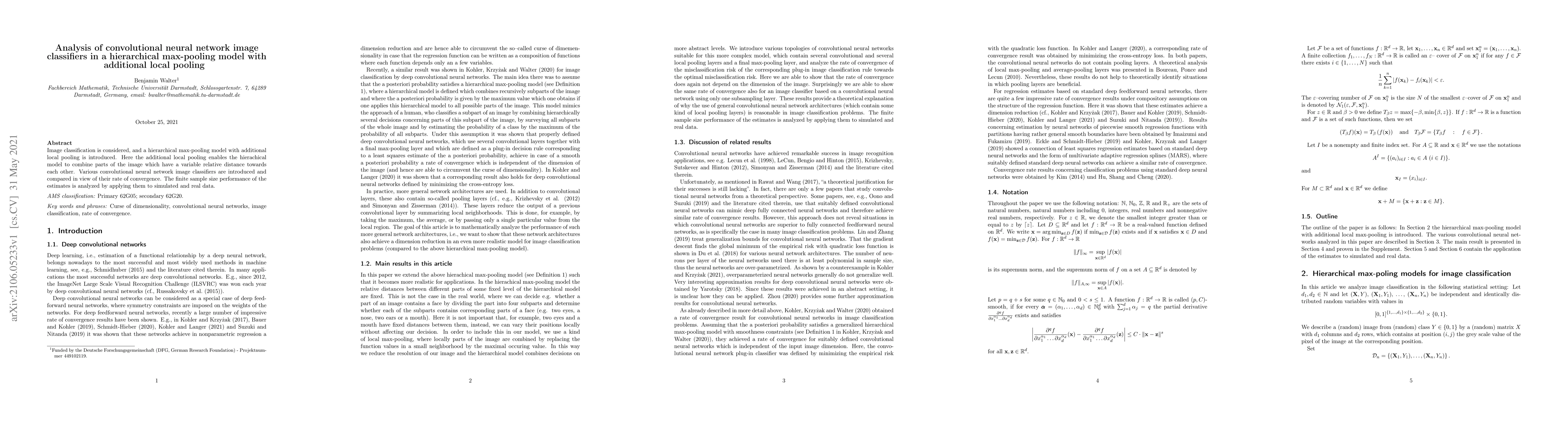 This paper introduces a hierarchical max-pooling model with additional local pooling for convolutional neural network image classifiers, comparing their convergence rates. The performance of various classifiers is analyzed on both simulated and real data to assess their finite sample size effectiveness.