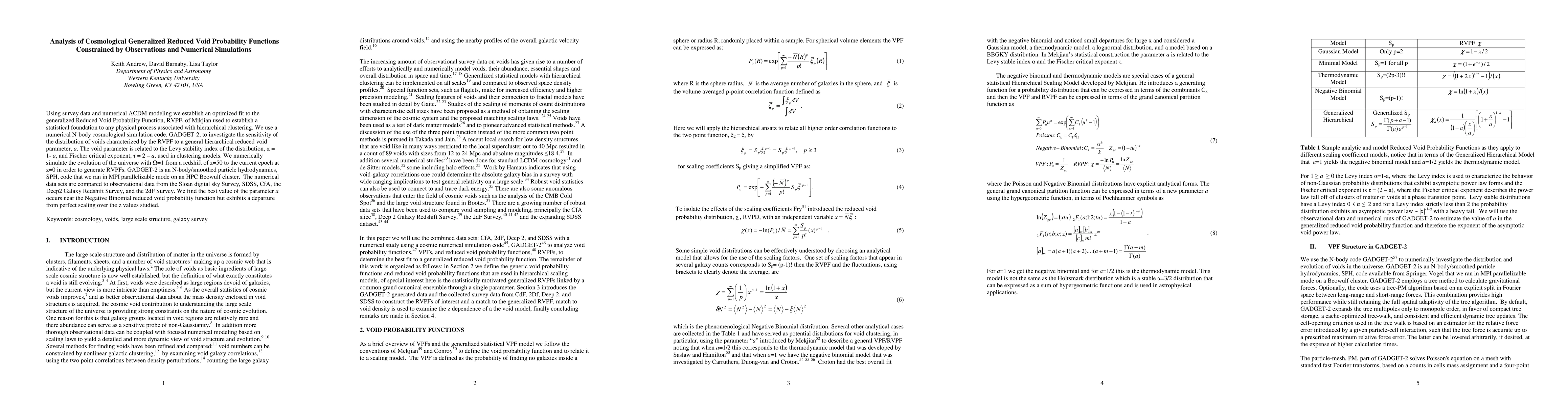 Using survey data and numerical LCDM modeling we establish an optimized fit to the generalized Reduced Void Probability Function, RVPF, of Mikjian used to establish a statistical foundation to any physical process associated with hierarchical clustering. We use a numerical N-body cosmological simulation code, GADGET-2, to investigate the sensitivity of the distribution of voids characterized by the RVPF to a general hierarchical reduced void parameter, a. The void parameter is related to the Levy stability index of the distribution and Fischer critical exponent used in clustering models. We numerically simulate the evolution of the universe from a redshift of z=50 to the current epoch at z=0 in order to generate RVPFs. GADGET-2 is an N-body/smoothed particle hydrodynamics, SPH, code that we ran in MPI parallelizable mode on an HPC Beowulf cluster. The numerical data sets are compared to observational data from the Sloan digital sky Survey, SDSS, CfA, the Deep2 Galaxy Redshift Survey, and the 2dF Survey. We find the best value of the parameter a occurs near the Negative Binomial reduced void probability function but exhibits a departure from perfect scaling over the z values studied.