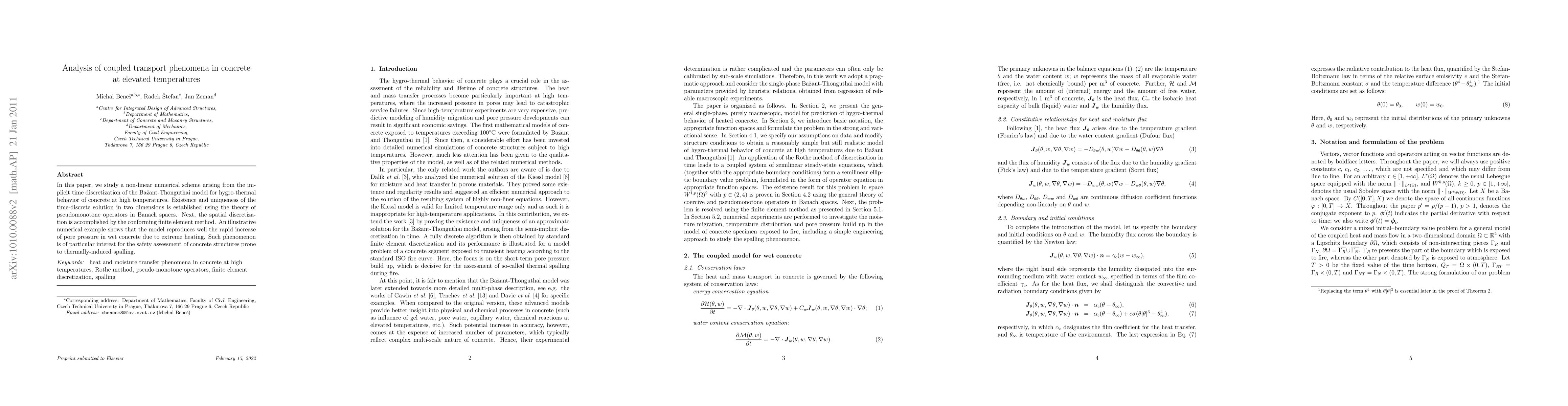 In this paper, we study a non-linear numerical scheme arising from the implicit time discretization of the Ba\v{z}ant-Thonguthai model for hygro-thermal behavior of concrete at high temperatures. Existence and uniqueness of the time-discrete solution in two dimensions is established using the theory of pseudomonotone operators in Banach spaces. Next, the spatial discretization is accomplished by the conforming finite element method. An illustrative numerical example shows that the numerical model reproduces well the rapid increase of pore pressure in wet concrete due to extreme heating. Such phenomenon is of particular interest for the safety assessment of concrete structures prone to thermally-induced spalling.