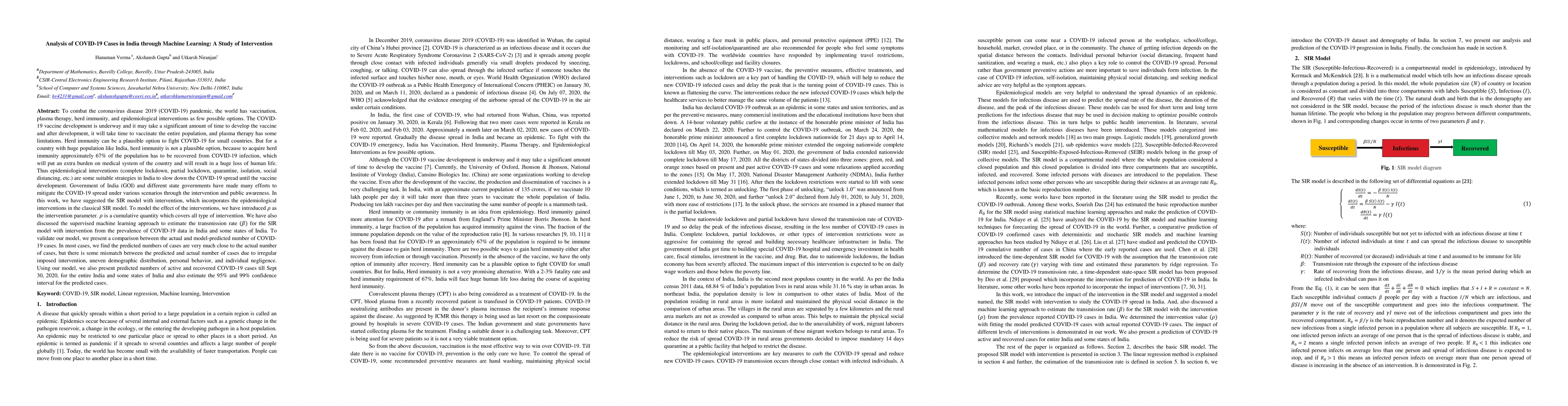 This study employs machine learning to analyze COVID-19 cases in India, proposing a modified SIR model with an intervention parameter to account for epidemiological strategies like lockdowns. The research estimates the transmission rate using supervised learning and validates the model by comparing predicted and actual case numbers, providing forecasts for active and recovered cases with confidence intervals.