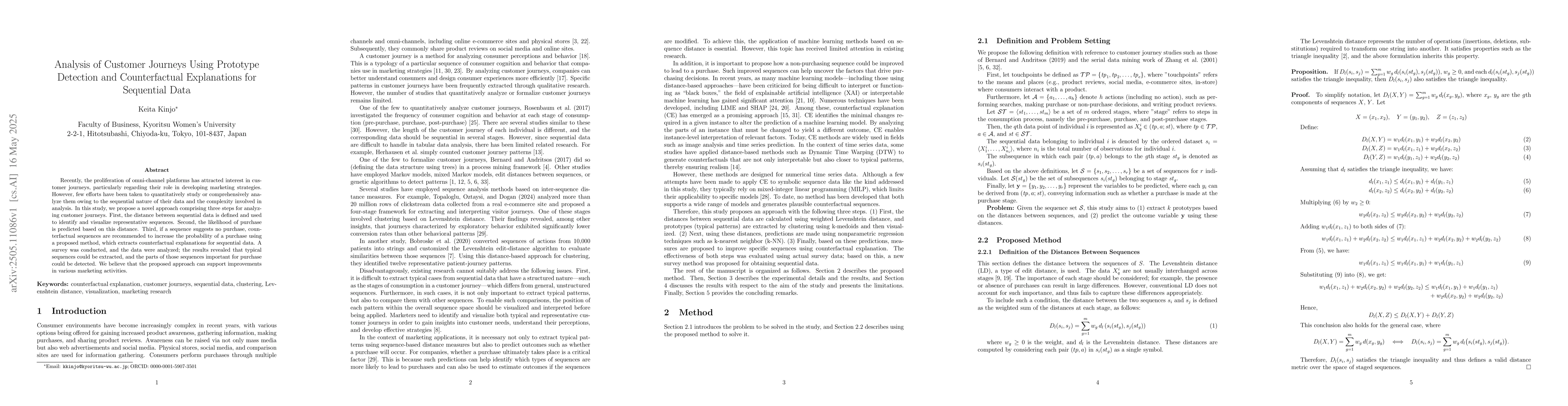 The research proposes a three-step approach for analyzing customer journeys: defining distance between sequential data to identify representative sequences, predicting purchase likelihood based on this distance, and recommending counterfactual sequences to increase purchase probability using a method that extracts explanations for sequential data.