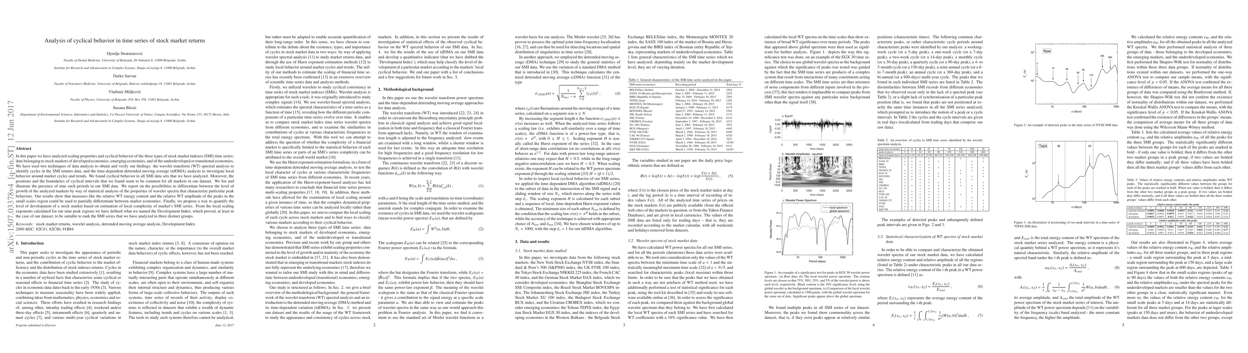 This paper analyzes the cyclical behavior in time series of stock market returns across developed, emerging, and underdeveloped economies using wavelet spectral analysis and Hurst exponent. It identifies common cyclical intervals and proposes a Development Index based on local scaling exponents to rank different market economies.