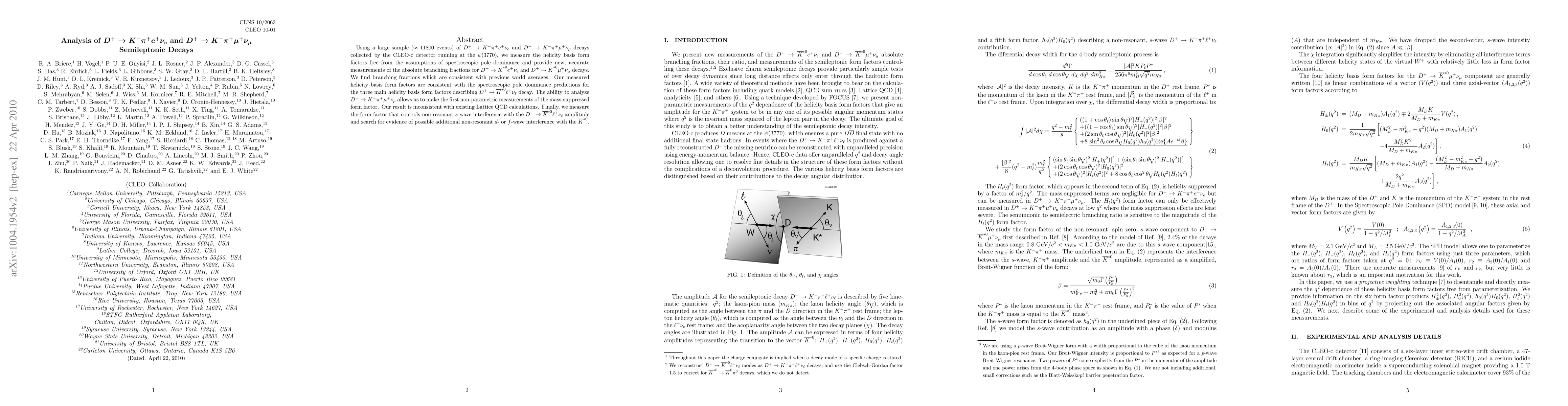 This study analyzes D+ decays into K- pi+ e+ νe and D+ decays into K- pi+ μ+ νμ using data from the CLEO-c detector, measuring helicity basis form factors and branching fractions without relying on spectroscopic pole dominance assumptions. The results are consistent with previous averages but show discrepancies with existing Lattice QCD calculations.