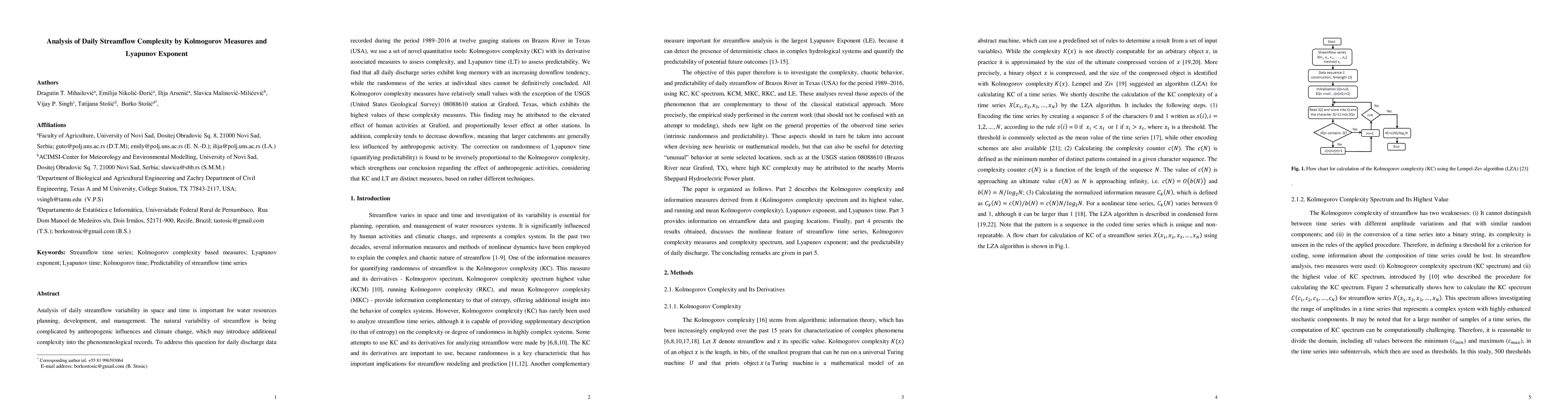 Analysis of daily streamflow variability in space and time is important for water resources planning, development, and management. The natural variability of streamflow is being complicated by anthropogenic influences and climate change, which may introduce additional complexity into the phenomenological records. To address this question for daily discharge data recorded during the period 1989-2016 at twelve gauging stations on Brazos River in Texas (USA), we use a set of novel quantitative tools: Kolmogorov complexity (KC) with its derivative associated measures to assess complexity, and Lyapunov time (LT) to assess predictability. We find that all daily discharge series exhibit long memory with an increasing downflow tendency, while the randomness of the series at individual sites cannot be definitively concluded. All Kolmogorov complexity measures have relatively small values with the exception of the USGS (United States Geological Survey) 08088610 station at Graford, Texas, which exhibits the highest values of these complexity measures. This finding may be attributed to the elevated effect of human activities at Graford, and proportionally lesser effect at other stations. In addition, complexity tends to decrease downflow, meaning that larger catchments are generally less influenced by anthropogenic activity. The correction on randomness of Lyapunov time (quantifying predictability) is found to be inversely proportional to the Kolmogorov complexity, which strengthens our conclusion regarding the effect of anthropogenic activities, considering that KC and LT are distinct measures, based on rather different techniques.