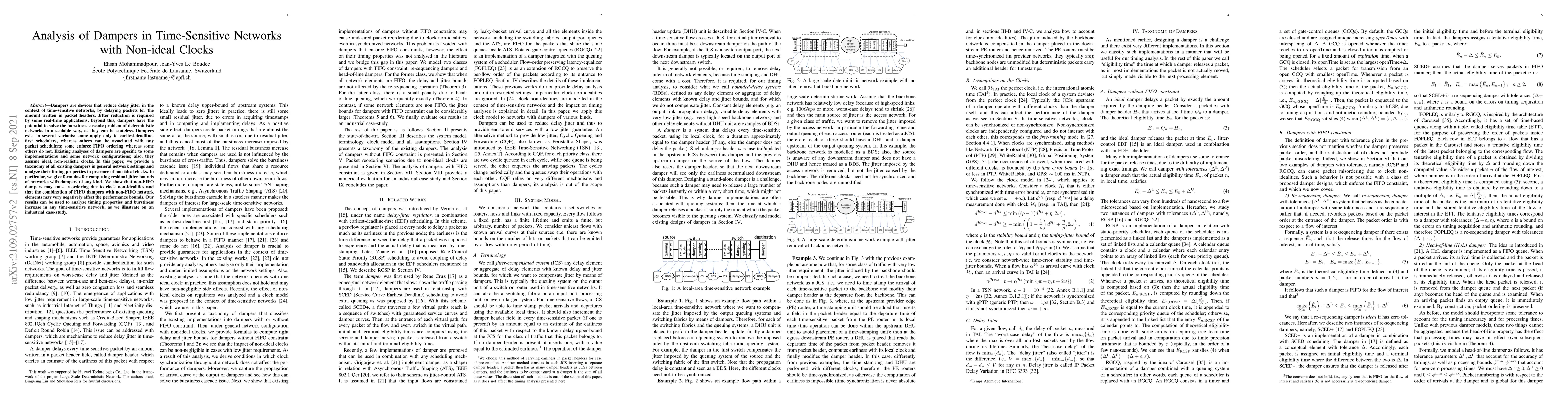 Dampers are devices that reduce delay jitter in the context of time-sensitive networks, by delaying packets for the amount written in packet headers. Jitter reduction is required by some real-time applications; beyond this, dampers have the potential to solve the burstiness cascade problem of deterministic networks in a scalable way, as they can be stateless. Dampers exist in several variants: some apply only to earliest-deadline-first schedulers, whereas others can be associated with any packet schedulers; some enforce FIFO ordering whereas some others do not. Existing analyses of dampers are specific to some implementations and some network configurations; also, they assume ideal, non-realistic clocks. In this paper, we provide a taxonomy of all existing dampers in general network settings and analyze their timing properties in presence of non-ideal clocks. In particular, we give formulas for computing residual jitter bounds of networks with dampers of any kind. We show that non-FIFO dampers may cause reordering due to clock non-idealities and that the combination of FIFO dampers with non-FIFO network elements may very negatively affect the performance bounds. Our results can be used to analyze timing properties and burstiness increase in any time-sensitive network, as we illustrate on an industrial case-study.