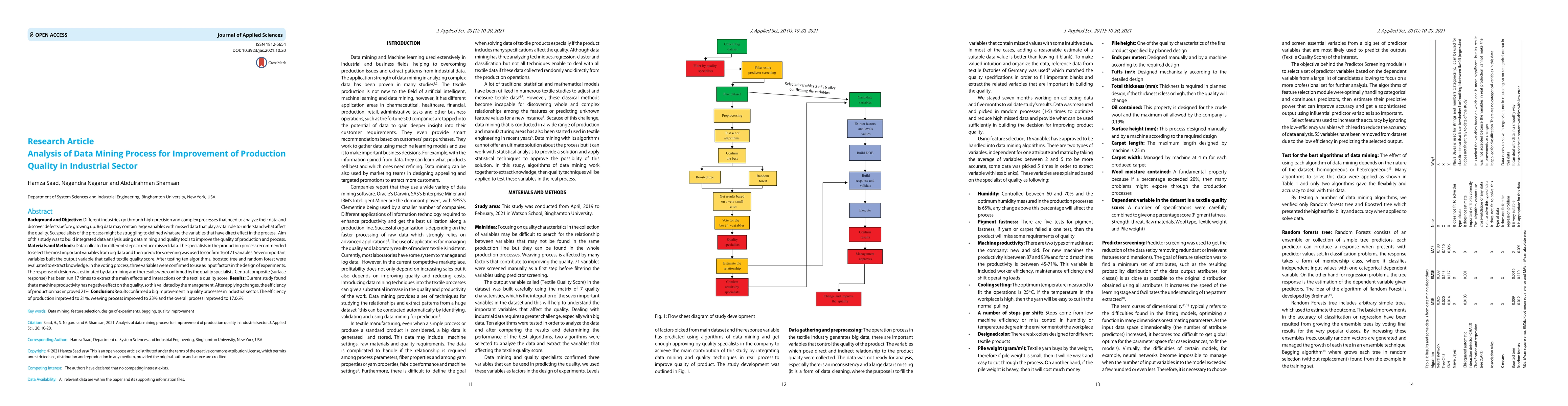 Background and Objective: Different industries go through high-precision and complex processes that need to analyze their data and discover defects before growing up. Big data may contain large variables with missed data that play a vital role to understand what affect the quality. So, specialists of the process might be struggling to defined what are the variables that have direct effect in the process. Aim of this study was to build integrated data analysis using data mining and quality tools to improve the quality of production and process. Materials and Methods: Data collected in different steps to reduce missed data. The specialists in the production process recommended to select the most important variables from big data and then predictor screening was used to confirm 16 of 71 variables. Seven important variables built the output variable that called textile quality score. After testing ten algorithms, boosted tree and random forest were evaluated to extract knowledge. In the voting process, three variables were confirmed to use as input factors in the design of experiments. The response of design was estimated by data mining and the results were confirmed by the quality specialists. Central composite (surface response) has been run 17 times to extract the main effects and interactions on the textile quality score. Results: Current study found that a machine productivity has negative effect on the quality, so this validated by the management. After applying changes, the efficiency of production has improved 21%. Conclusion: Results confirmed a big improvement in quality processes in industrial sector. The efficiency of production improved to 21%, weaving process improved to 23% and the overall process improved to 17.06%.