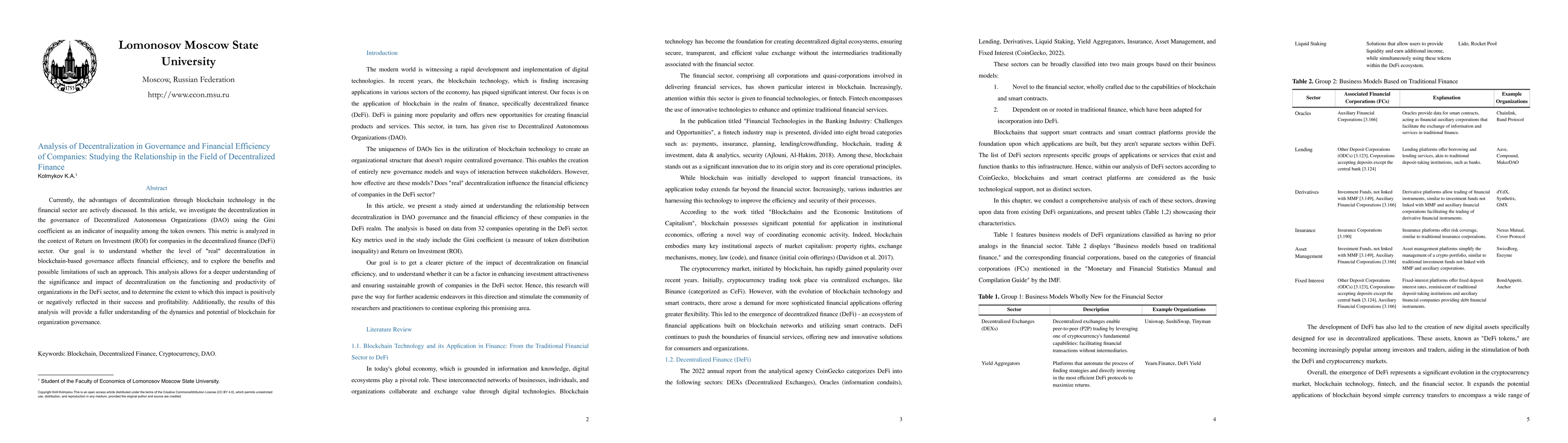 This paper examines the relationship between governance decentralization in Decentralized Autonomous Organizations (DAOs) and financial efficiency, using the Gini coefficient to measure inequality among token owners and Return on Investment (ROI) as a financial metric. The study aims to determine if "real" decentralization in blockchain governance impacts the success and profitability of companies in the decentralized finance (DeFi) sector.