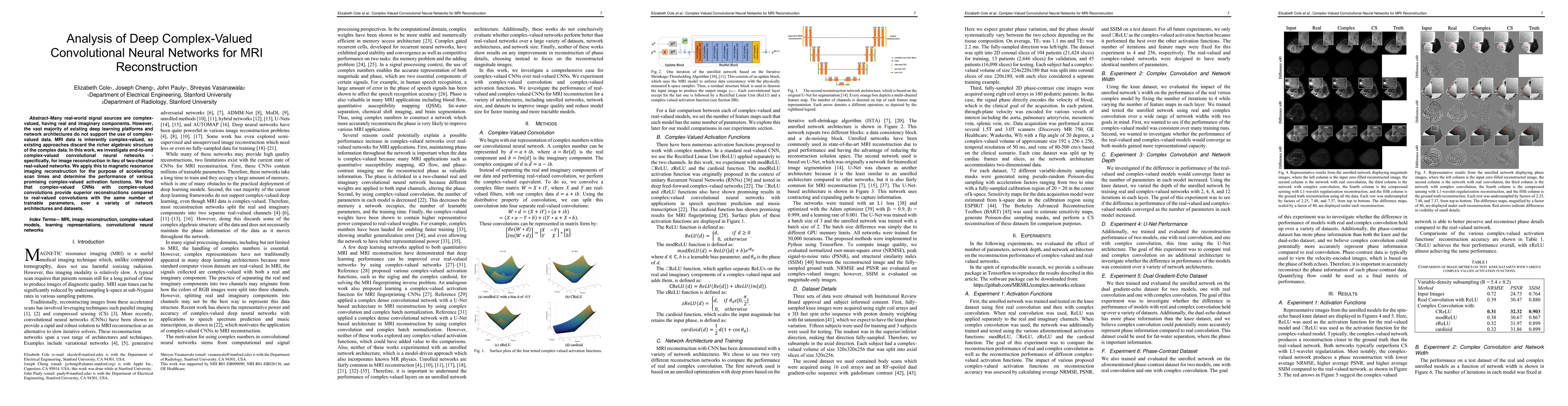 Many real-world signal sources are complex-valued, having real and imaginary components. However, the vast majority of existing deep learning platforms and network architectures do not support the use of complex-valued data. MRI data is inherently complex-valued, so existing approaches discard the richer algebraic structure of the complex data. In this work, we investigate end-to-end complex-valued convolutional neural networks - specifically, for image reconstruction in lieu of two-channel real-valued networks. We apply this to magnetic resonance imaging reconstruction for the purpose of accelerating scan times and determine the performance of various promising complex-valued activation functions. We find that complex-valued CNNs with complex-valued convolutions provide superior reconstructions compared to real-valued convolutions with the same number of trainable parameters, over a variety of network architectures and datasets.