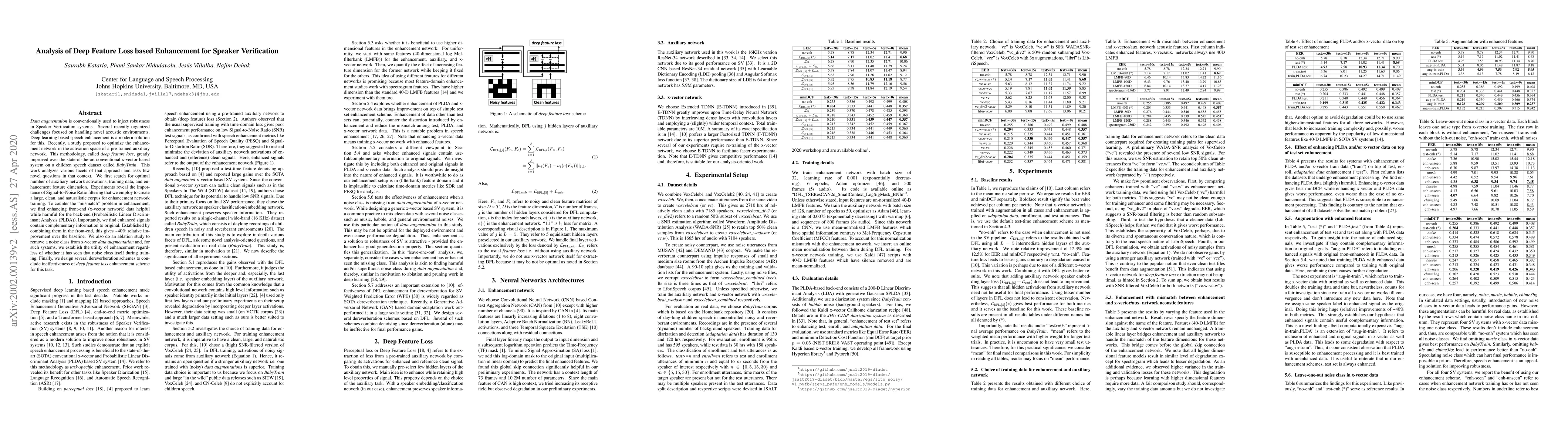 Data augmentation is conventionally used to inject robustness in Speaker Verification systems. Several recently organized challenges focus on handling novel acoustic environments. Deep learning based speech enhancement is a modern solution for this. Recently, a study proposed to optimize the enhancement network in the activation space of a pre-trained auxiliary network. This methodology, called deep feature loss, greatly improved over the state-of-the-art conventional x-vector based system on a children speech dataset called BabyTrain. This work analyzes various facets of that approach and asks few novel questions in that context. We first search for optimal number of auxiliary network activations, training data, and enhancement feature dimension. Experiments reveal the importance of Signal-to-Noise Ratio filtering that we employ to create a large, clean, and naturalistic corpus for enhancement network training. To counter the "mismatch" problem in enhancement, we find enhancing front-end (x-vector network) data helpful while harmful for the back-end (Probabilistic Linear Discriminant Analysis (PLDA)). Importantly, we find enhanced signals contain complementary information to original. Established by combining them in front-end, this gives ~40% relative improvement over the baseline. We also do an ablation study to remove a noise class from x-vector data augmentation and, for such systems, we establish the utility of enhancement regardless of whether it has seen that noise class itself during training. Finally, we design several dereverberation schemes to conclude ineffectiveness of deep feature loss enhancement scheme for this task.