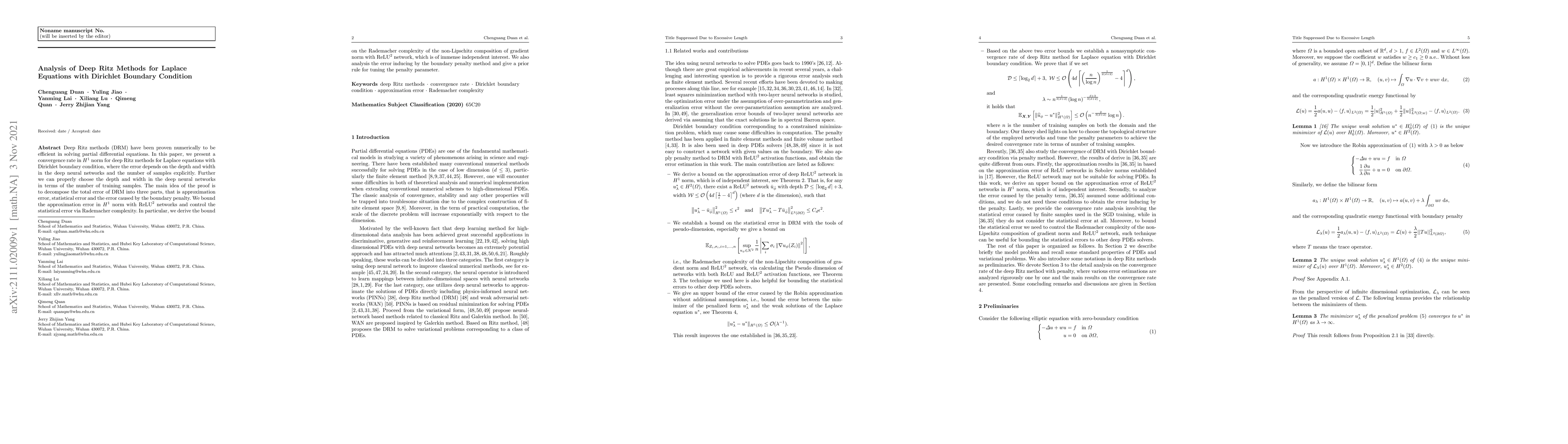 This paper analyzes the convergence rate of deep Ritz methods for solving Laplace equations with Dirichlet boundary conditions, showing that the error depends on neural network depth, width, and sample size. The authors decompose the total error into approximation, statistical, and boundary penalty errors, providing bounds for each component and offering guidelines for tuning network parameters.