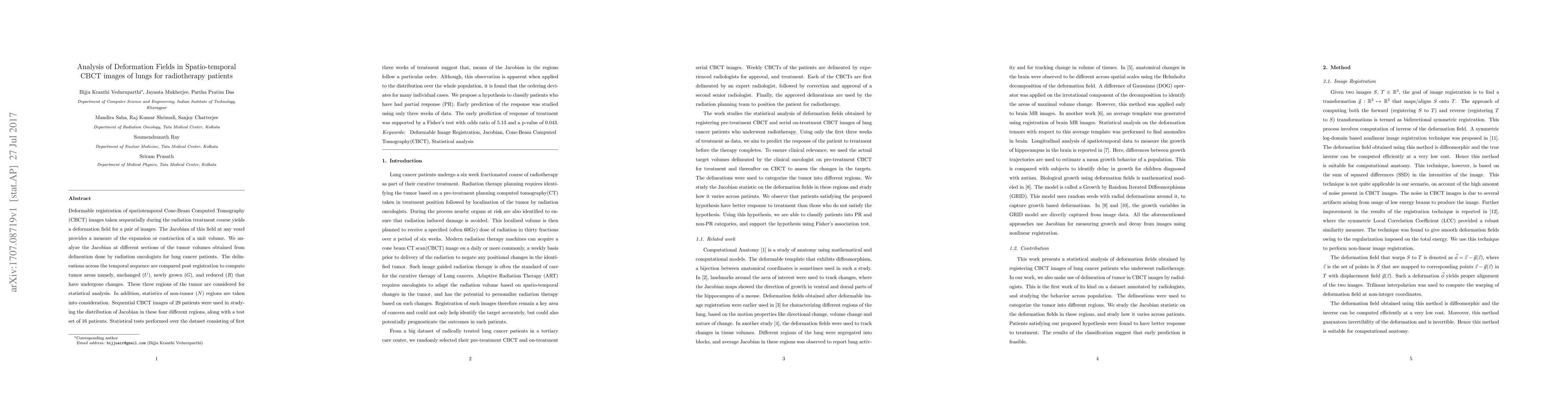 Deformable registration of spatiotemporal Cone-Beam Computed Tomography (CBCT) images taken sequentially during the radiation treatment course yields a deformation field for a pair of images. The Jacobian of this field at any voxel provides a measure of the expansion or contraction of a unit volume. We analyze the Jacobian at different sections of the tumor volumes obtained from delineation done by radiation oncologists for lung cancer patients. The delineations across the temporal sequence are compared post registration to compute tumor areas namely, unchanged (U), newly grown (G), and reduced (R) that have undergone changes. These three regions of the tumor are considered for statistical analysis. In addition, statistics of non-tumor (N) regions are taken into consideration. Sequential CBCT images of 29 patients were used in studying the distribution of Jacobian in these four different regions, along with a test set of 16 patients. Statistical tests performed over the dataset consisting of first three weeks of treatment suggest that, means of the Jacobian in the regions follow a particular order. Although, this observation is apparent when applied to the distribution over the whole population, it is found that the ordering deviates for many individual cases. We propose a hypothesis to classify patients who have had partial response (PR). Early prediction of the response was studied using only three weeks of data. The early prediction of response of treatment was supported by a Fisher's test with odds ratio of 5.13 and a p-value of 0.043.