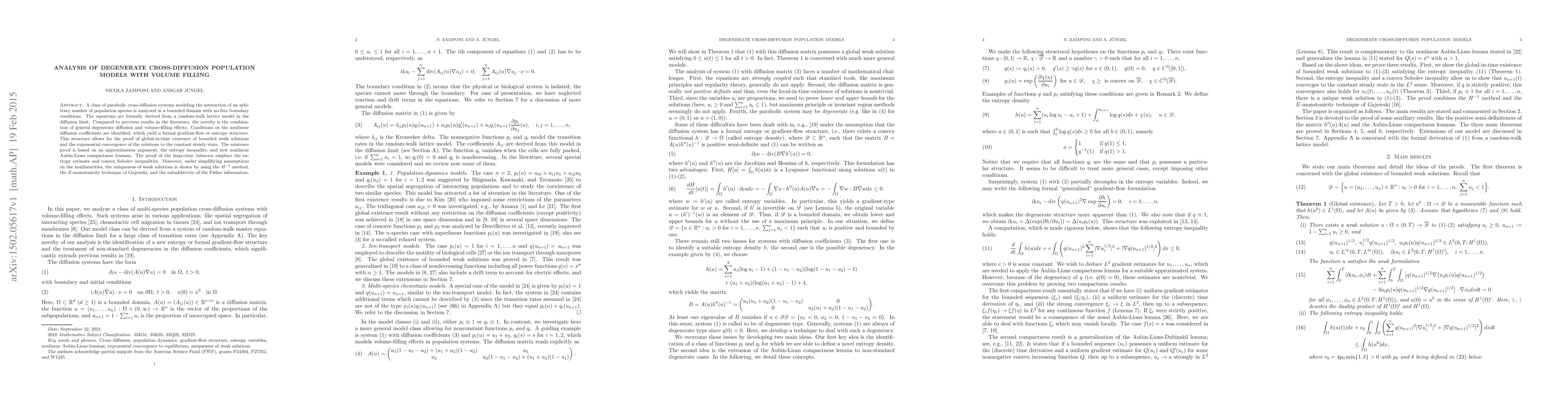 This paper analyzes degenerate cross-diffusion population models incorporating volume-filling effects, proving global-in-time existence and exponential convergence of solutions to steady states. Uniqueness and compactness results are established using entropy inequalities and novel nonlinear Aubin-Lions lemmas.