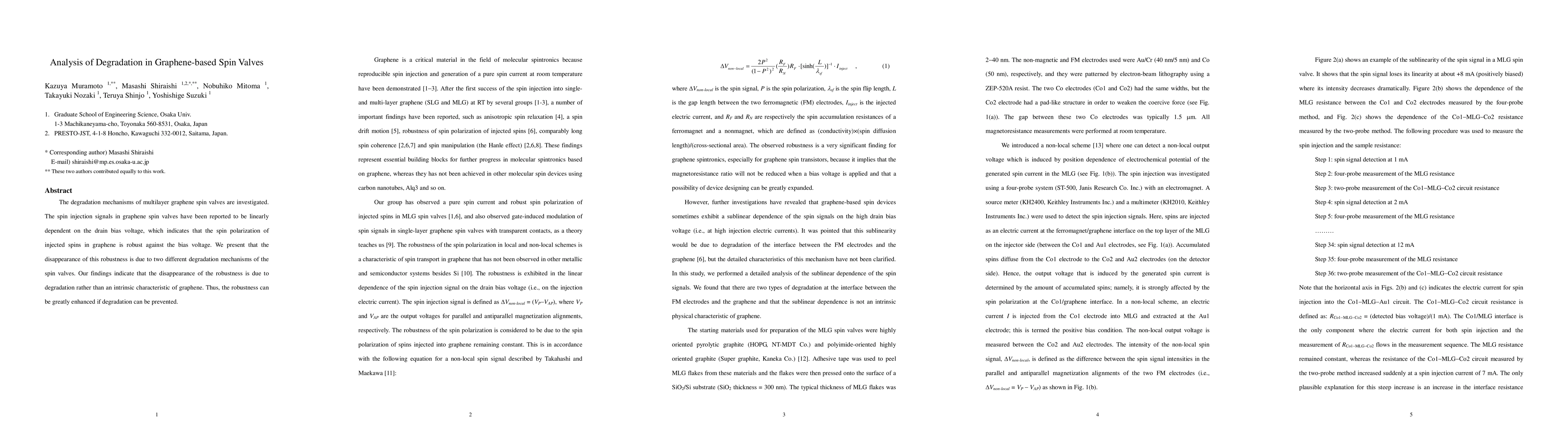 The degradation mechanisms of multilayer graphene spin valves are investigated. The spin injection signals in graphene spin valves have been reported to be linearly dependent on the drain bias voltage, which indicates that the spin polarization of injected spins in graphene is robust against the bias voltage. We present that the disappearance of this robustness is due to two different degradation mechanisms of the spin valves. Our findings indicate that the disappearance of the robustness is due to degradation rather than an intrinsic characteristic of graphene. Thus, the robustness can be greatly enhanced if degradation can be prevented.