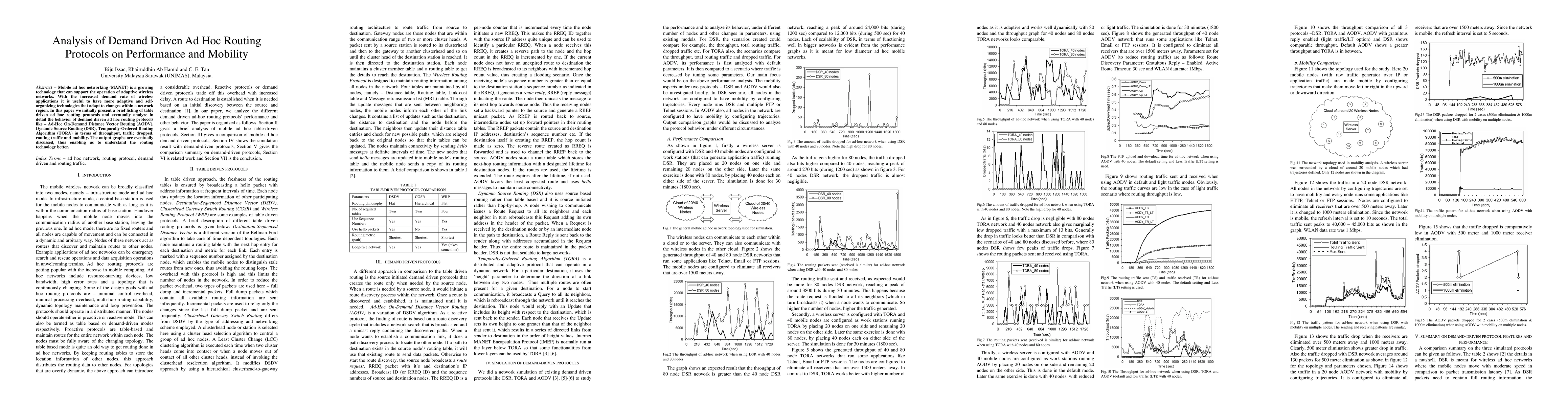 This paper analyzes the performance of demand driven ad hoc routing protocols, including AODV, DSR, and TORA, focusing on throughput, dropped traffic, routing traffic, and mobility. The study aims to better understand adaptive wireless network technologies in mobile ad hoc networks (MANET).