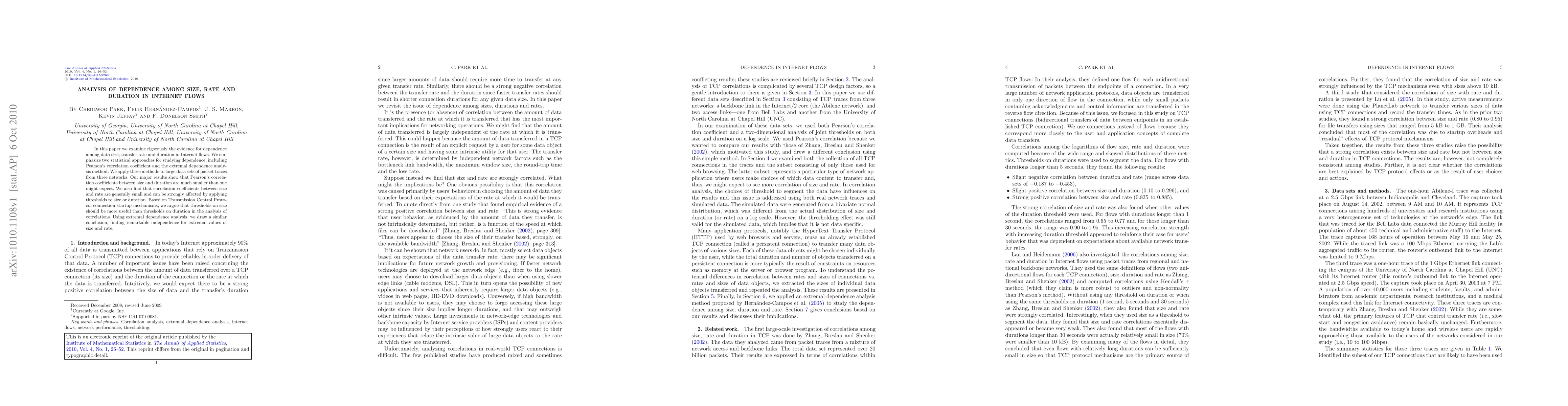 In this paper we examine rigorously the evidence for dependence among data size, transfer rate and duration in Internet flows. We emphasize two statistical approaches for studying dependence, including Pearson's correlation coefficient and the extremal dependence analysis method. We apply these methods to large data sets of packet traces from three networks. Our major results show that Pearson's correlation coefficients between size and duration are much smaller than one might expect. We also find that correlation coefficients between size and rate are generally small and can be strongly affected by applying thresholds to size or duration. Based on Transmission Control Protocol connection startup mechanisms, we argue that thresholds on size should be more useful than thresholds on duration in the analysis of correlations. Using extremal dependence analysis, we draw a similar conclusion, finding remarkable independence for extremal values of size and rate.