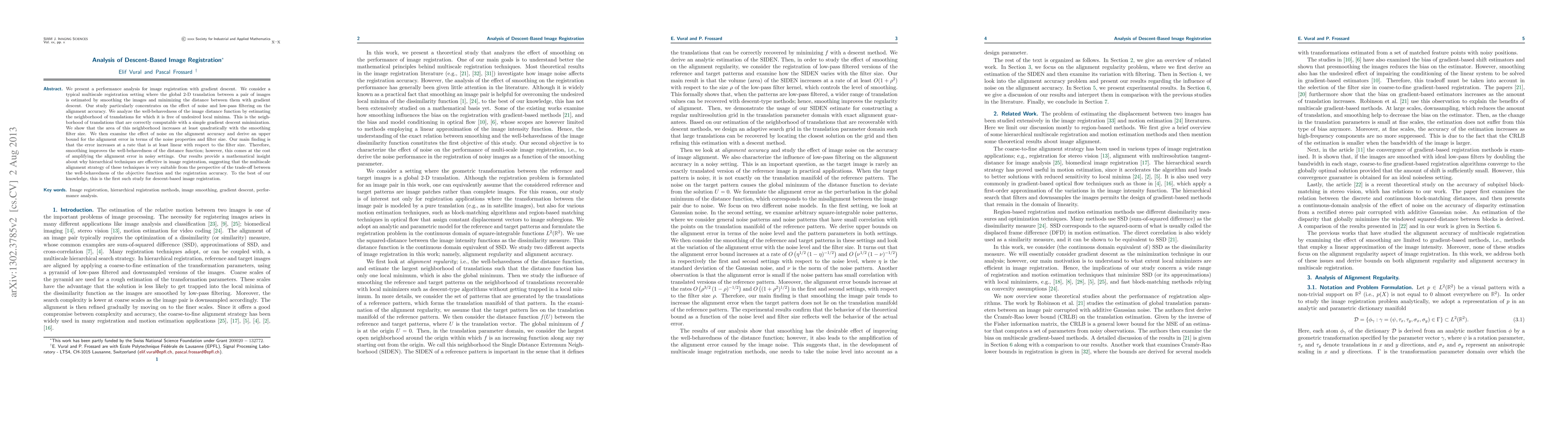 This paper analyzes the performance of gradient descent methods for image registration, focusing on the impact of noise and smoothing on alignment accuracy. It finds that smoothing enhances the well-behavedness of the distance function but increases alignment error linearly with filter size, supporting the effectiveness of hierarchical multiscale registration techniques.