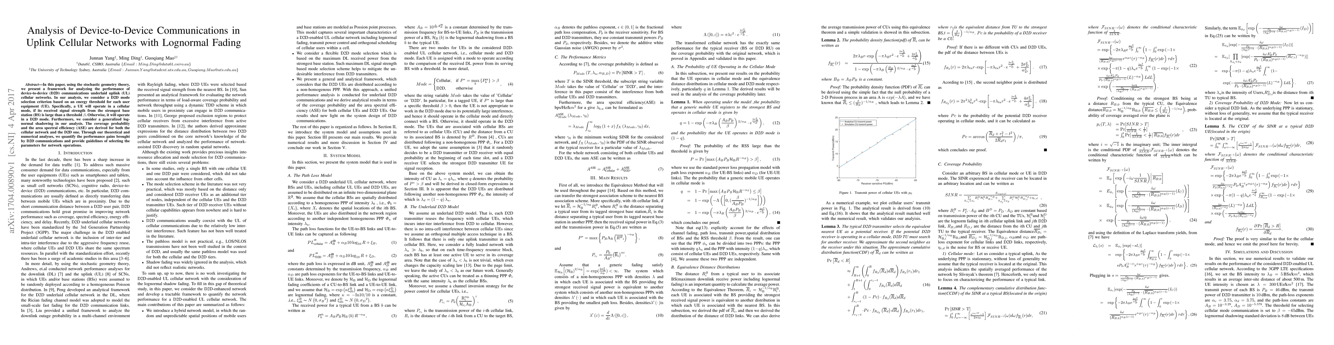 This paper uses stochastic geometry to analyze D2D communications in uplink cellular networks with a lognormal fading model. It derives coverage probability and area spectral efficiency for both cellular and D2D modes, providing insights into performance gains and parameter selection for network operations.