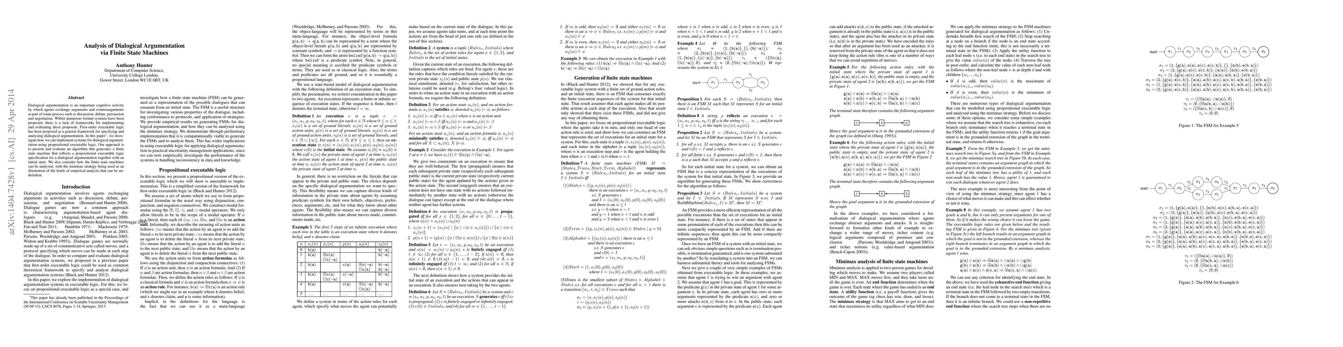 This paper explores implementing dialogical argumentation systems using propositional executable logic, presenting an algorithm to generate finite state machines for these specifications. It also examines how these machines can be analyzed, using the minimax strategy as an example of empirical analysis methods.