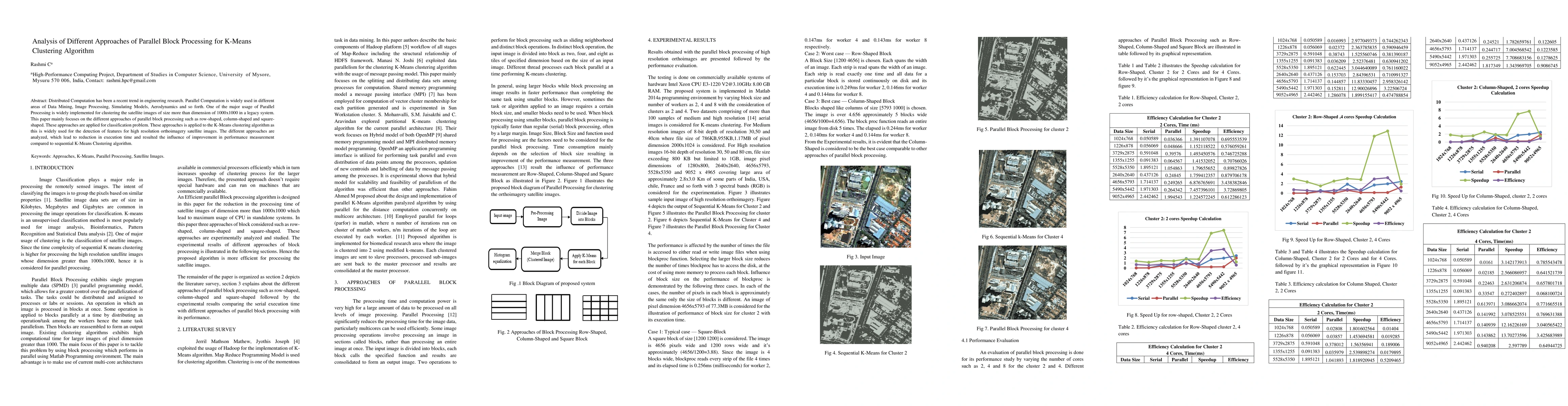 Distributed Computation has been a recent trend in engineering research. Parallel Computation is widely used in different areas of Data Mining, Image Processing, Simulating Models, Aerodynamics and so forth. One of the major usage of Parallel Processing is widely implemented for clustering the satellite images of size more than dimension of 1000x1000 in a legacy system. This paper mainly focuses on the different approaches of parallel block processing such as row-shaped, column-shaped and square-shaped. These approaches are applied for classification problem. These approaches is applied to the K-Means clustering algorithm as this is widely used for the detection of features for high resolution orthoimagery satellite images. The different approaches are analyzed, which lead to reduction in execution time and resulted the influence of improvement in performance measurement compared to sequential K-Means Clustering algorithm.