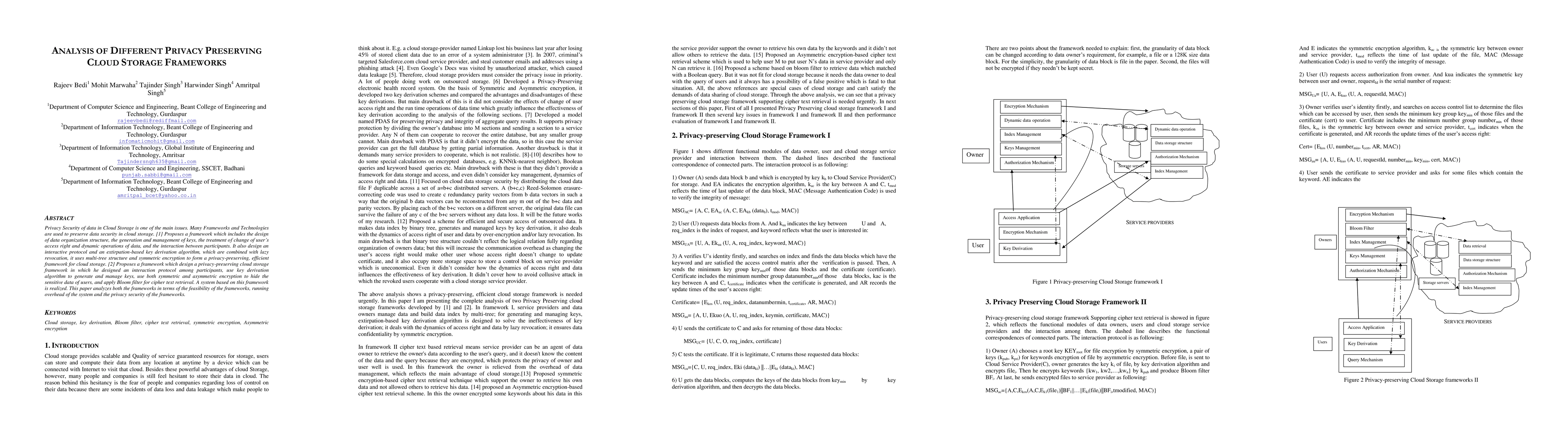 Privacy Security of data in Cloud Storage is one of the main issues. Many Frameworks and Technologies are used to preserve data security in cloud storage. [1] Proposes a framework which includes the design of data organization structure, the generation and management of keys, the treatment of change of user's access right and dynamic operations of data, and the interaction between participants. It also design an interactive protocol and an extirpation-based key derivation algorithm, which are combined with lazy revocation, it uses multi-tree structure and symmetric encryption to form a privacy-preserving, efficient framework for cloud storage. [2] Proposes a framework which design a privacy-preserving cloud storage framework in which he designed an interaction protocol among participants, use key derivation algorithm to generate and manage keys, use both symmetric and asymmetric encryption to hide the sensitive data of users, and apply Bloom filter for cipher text retrieval. A system based on this framework is realized. This paper analyzes both the frameworks in terms of the feasibility of the frameworks, running overhead of the system and the privacy security of the frameworks.