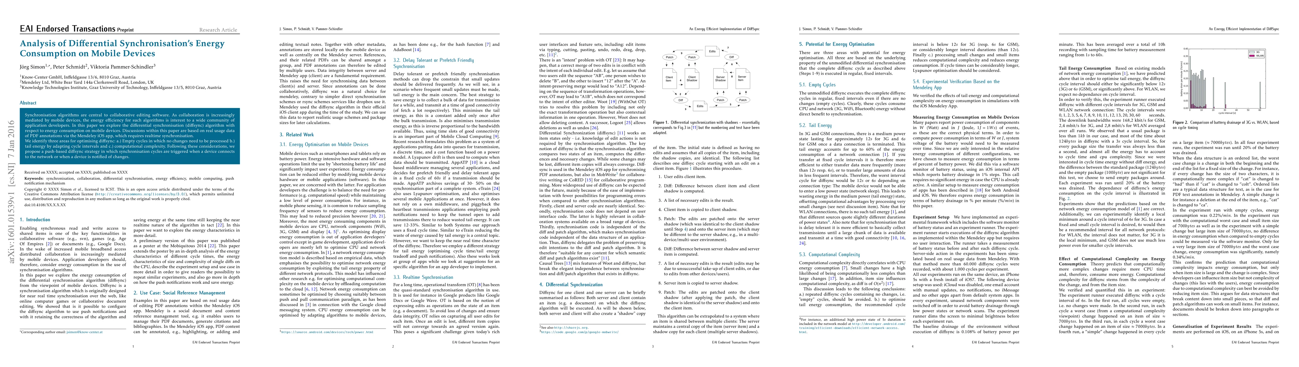 This paper investigates the energy consumption of differential synchronisation algorithms on mobile devices, focusing on real-time synchronisation in PDF annotation applications. The study identifies three optimisation areas: reducing empty cycles, adapting cycle intervals to mitigate tail energy, and lowering computational complexity, leading to a proposed push-based synchronisation strategy.