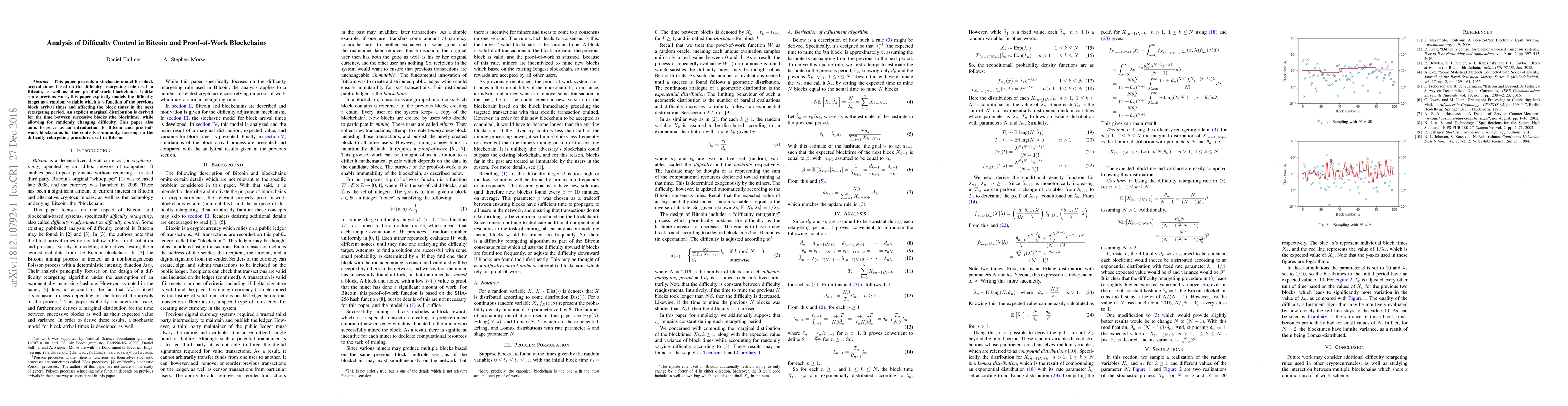This paper develops a stochastic model for block arrival times in Bitcoin and proof-of-work blockchains, treating the difficulty target as a random variable influenced by previous block times. It provides an explicit marginal distribution for block times and serves as an introduction to Bitcoin's difficulty retargeting for the controls community.