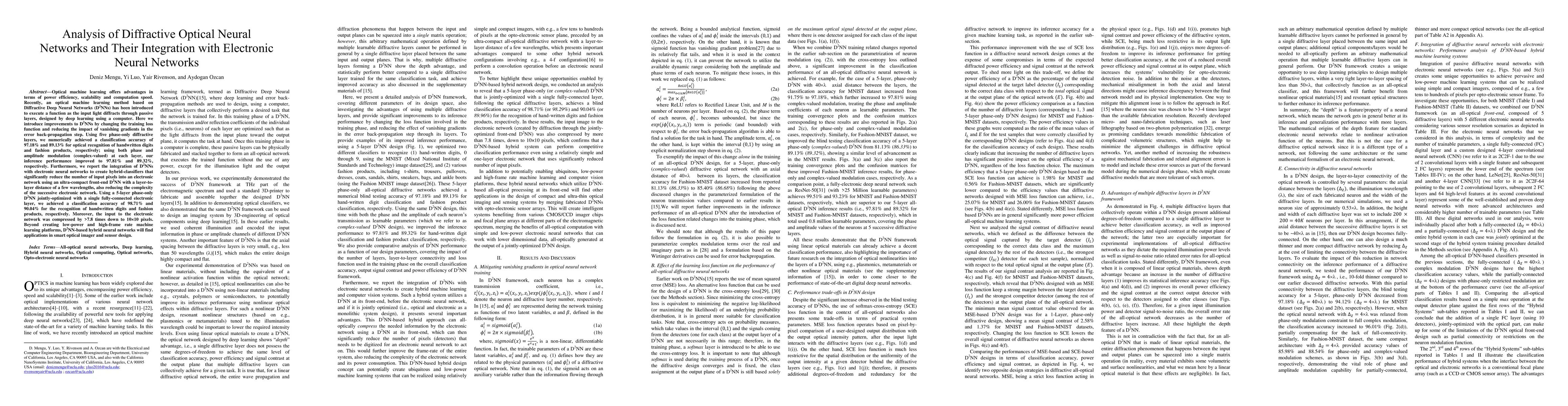 This paper presents enhancements to Diffractive Deep Neural Networks (D2NNs) through improved training methods and integration with electronic neural networks, achieving high classification accuracy for optical recognition tasks. The hybrid D2NN-electronic network model significantly reduces input complexity and enhances scalability, promising applications in low-power, high-speed machine learning systems.