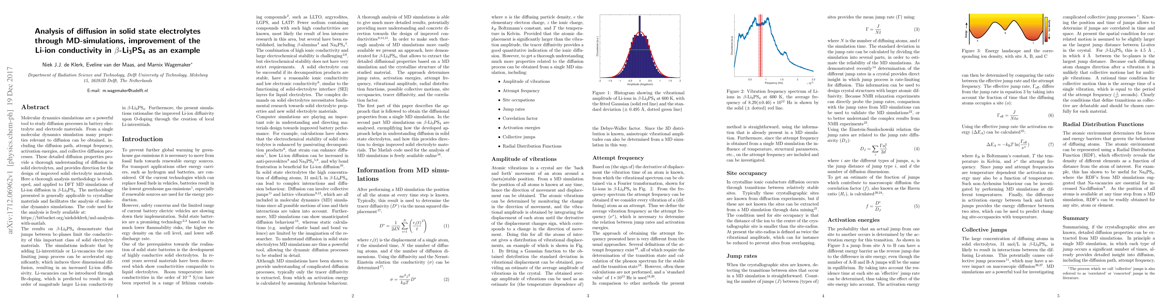 Molecular dynamics simulations are a powerful tool to study diffusion processes in battery electrolyte and electrode materials. From a single molecular dynamics simulation many properties relevant to diffusion can be obtained, including the diffusion path, attempt frequency, activation energies, and collective diffusion processes. These detailed diffusion properties provide a thorough understanding of diffusion in solid electrolytes, and provides direction for the design of improved solid electrolyte materials. Here a thorough analysis methodology is developed, and applied to DFT MD simulations of Li-ion diffusion in \beta-Li3PS4. The methodology presented is generally applicable to crystalline materials and facilitates the analysis of molecular dynamics simulations. The code used for the analysis is freely available at: https://bitbucket.org/niekdeklerk/md-analysis-with-matlab. The results on \beta-Li3PS4 demonstrate that jumps between bc-planes limit the conductivity of this important class of solid electrolyte materials. The simulations indicate that by adding Li-interstitials or Li-vacancies the rate limiting jump process can be accelerated significantly, which induces three dimensional diffusion, resulting in an increased Li-ion diffusivity. Li-vacancies can be introduced through Br-doping, which is predicted to result in an order of magnitude larger Li-ion conductivity in \beta-Li3PS4. Furthermore, the present simulations rationalise the improved Li-ion diffusivity upon O-doping through the creation of local Li-interstitials.