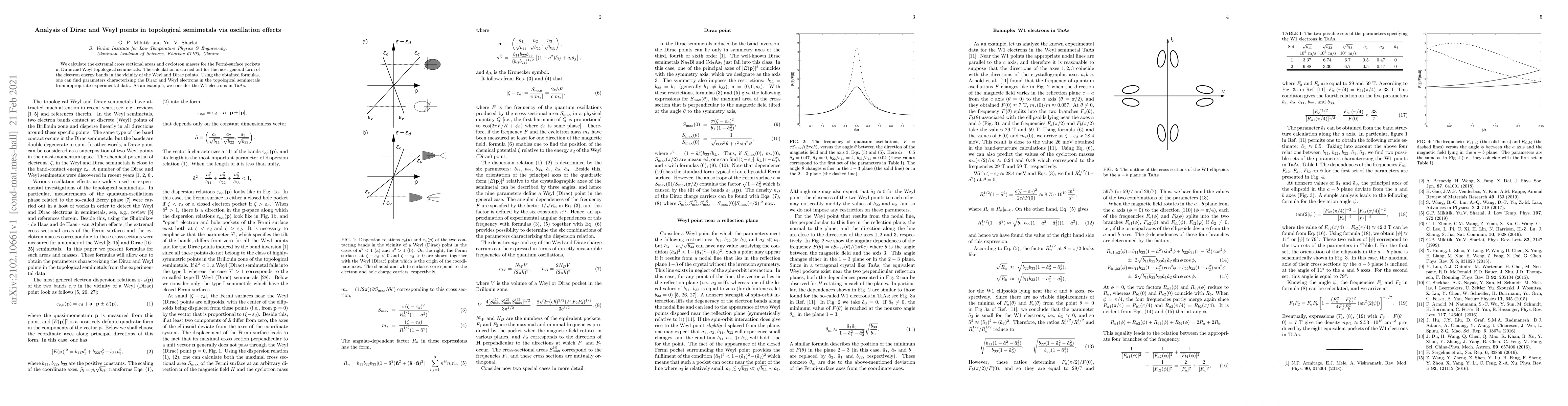 We calculate the extremal cross sectional areas and cyclotron masses for the Fermi-surface pockets in Dirac and Weyl topological semimetals. The calculation is carried out for the most general form of the electron energy bands in the vicinity of the Weyl and Dirac points. Using the obtained formulas, one can find parameters characterizing the Dirac and Weyl electrons in the topological semimetals from appropriate experimental data. As an example, we consider the W1 electrons in TaAs.