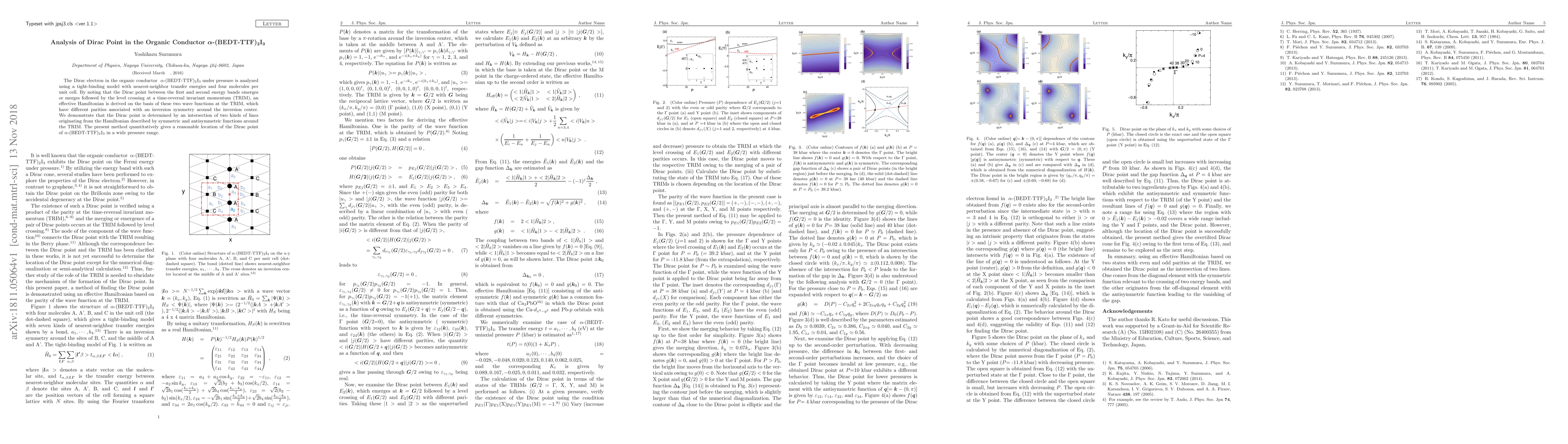 This paper analyzes the Dirac point in the organic conductor $\alpha$-(BEDT-TTF)$_2$I$_3$ under pressure using a tight-binding model. The study reveals that the Dirac point emerges through level crossing at a time-reversal invariant momentum, leading to an effective Hamiltonian that accurately locates the Dirac point over a broad pressure range.