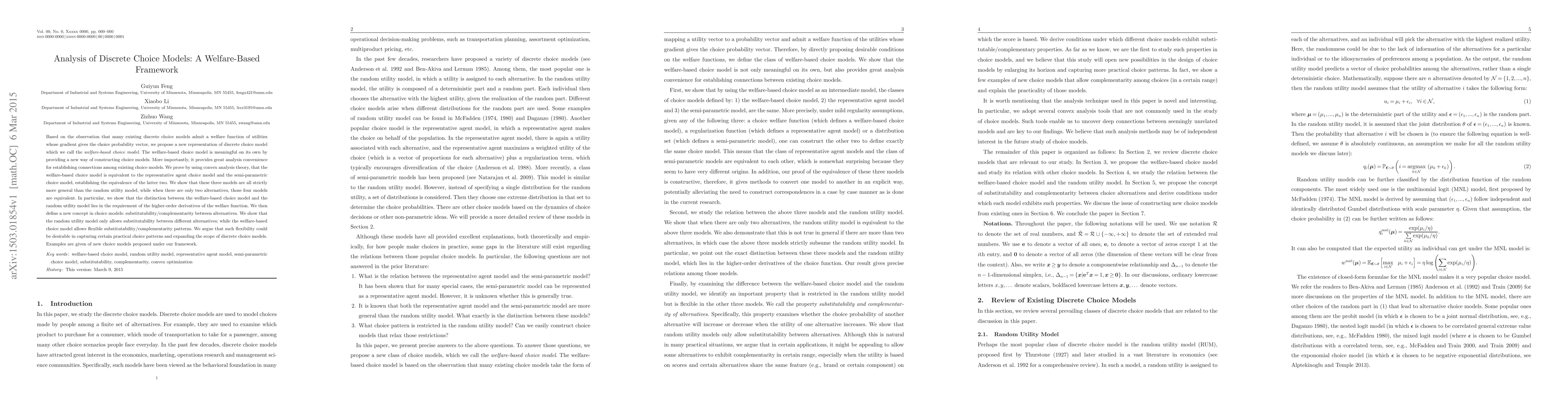 Based on the observation that many existing discrete choice models admit a welfare function of utilities whose gradient gives the choice probability vector, we propose a new representation of discrete choice model which we call the welfare-based choice model. The welfare-based choice model is meaningful on its own by providing a new way of constructing choice models. More importantly, it provides great analysis convenience for establishing connections among existing choice models. We prove by using convex analysis theory, that the welfare-based choice model is equivalent to the representative agent choice model and the semi-parametric choice model, establishing the equivalence of the latter two. We show that these three models are all strictly more general than the random utility model, while when there are only two alternatives, those four models are equivalent. In particular, we show that the distinction between the welfare-based choice model and the random utility model lies in the requirement of the higher-order derivatives of the welfare function. We then define a new concept in choice models: substitutability/complementarity between alternatives. We show that the random utility model only allows substitutability between different alternatives; while the welfare-based choice model allows flexible substitutability/complementarity patterns. We argue that such flexibility could be desirable in capturing certain practical choice patterns and expanding the scope of discrete choice models. Examples are given of new choice models proposed under our framework.