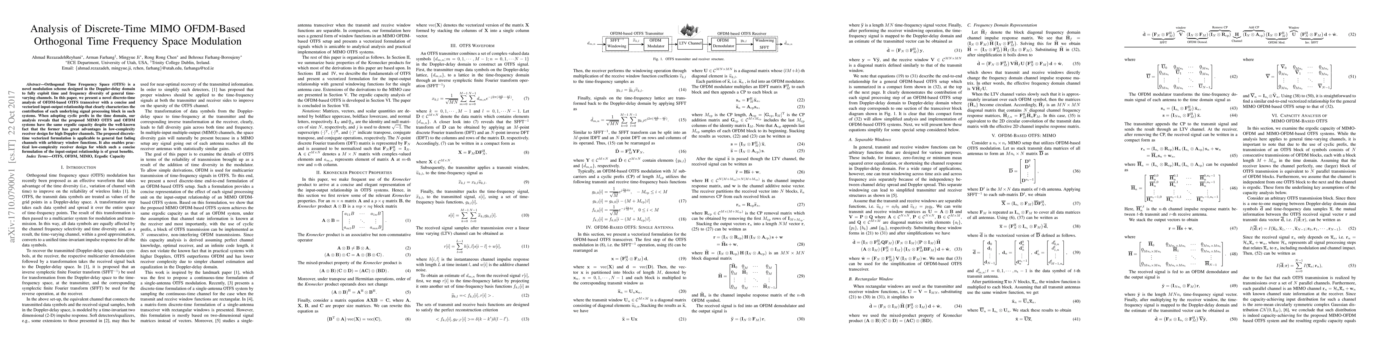 Orthogonal Time Frequency Space (OTFS) is a novel modulation scheme designed in the Doppler-delay domain to fully exploit time and frequency diversity of general time-varying channels. In this paper, we present a novel discrete-time analysis of OFDM-based OTFS transceiver with a concise and vectorized input-output relationship that clearly characterizes the contribution of each underlying signal processing block in such systems. When adopting cyclic prefix in the time domain, our analysis reveals that the proposed MIMO OTFS and OFDM systems have the same ergodic capacity despite the well-known fact that the former has great advantages in low-complexity receiver design for high Doppler channels. The proposed discrete-time vectorized formulation is applicable to general fast fading channels with arbitrary window functions. It also enables practical low-complexity receiver design for which such a concise formulation of the input-output relationship is of great benefits.