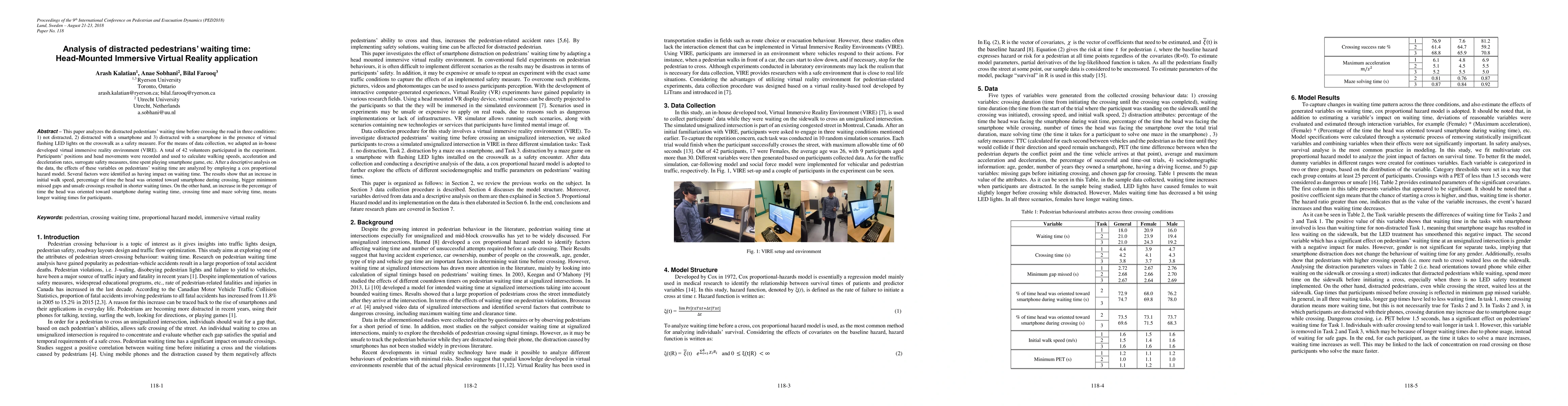 This study uses a head-mounted immersive virtual reality environment to analyze distracted pedestrians' waiting time at crosswalks under different conditions. Results from a Cox proportional hazard model indicate that factors like initial walk speed and smartphone use during waiting influence waiting times, with higher smartphone distraction correlating to shorter waiting times.