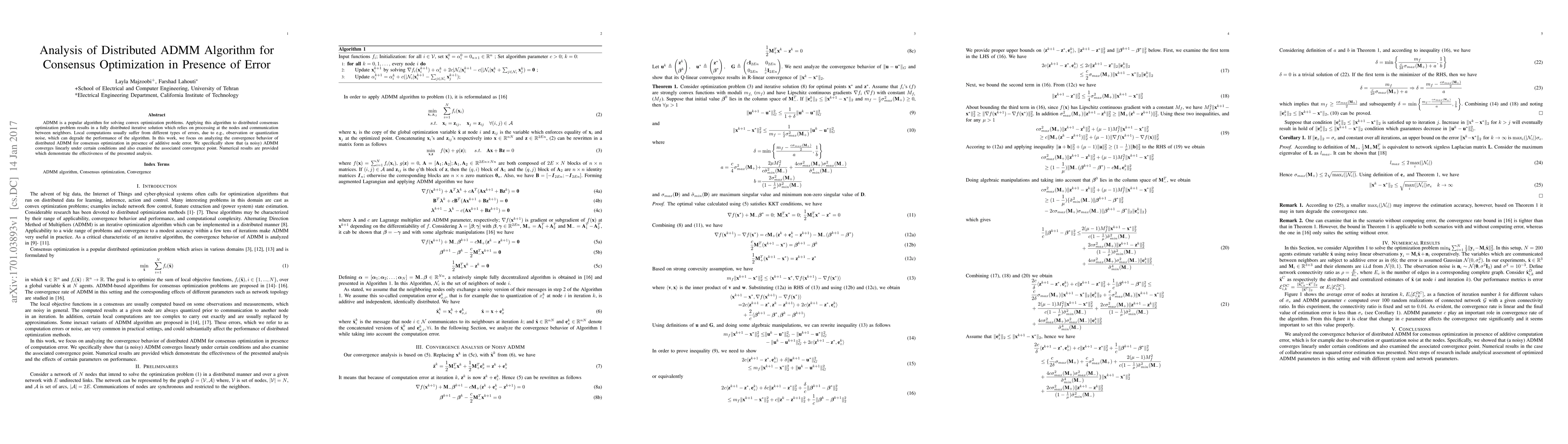 This paper analyzes the convergence behavior of distributed ADMM for consensus optimization under additive node errors. It demonstrates that the algorithm converges linearly under specific conditions and provides insights into the convergence point, supported by numerical results.