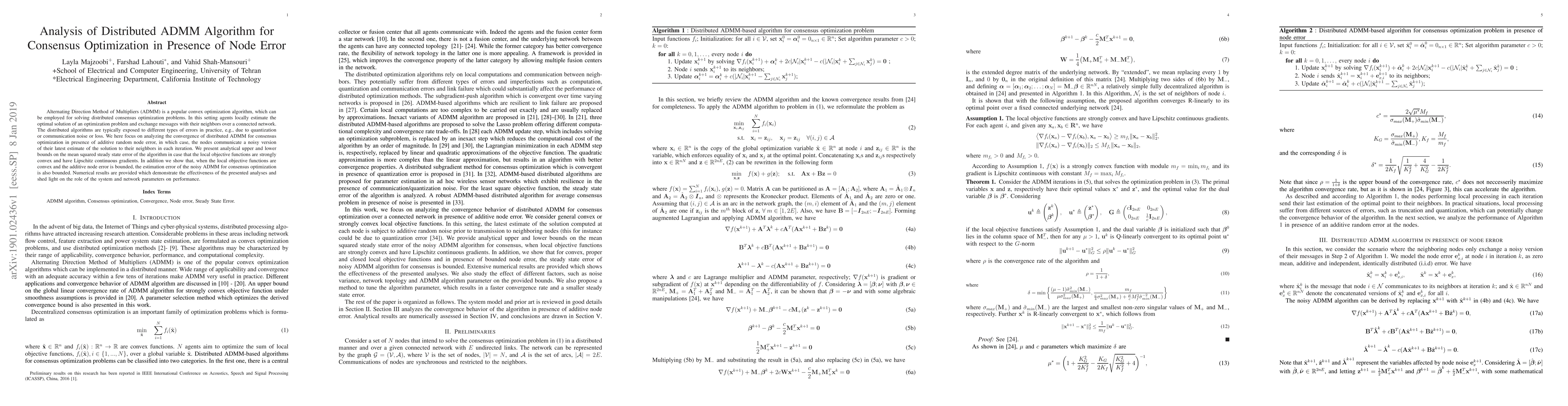 This paper analyzes the convergence of distributed ADMM under additive random node errors, presenting analytical bounds on the mean squared steady state error. It demonstrates bounded estimation error when local objective functions are convex and errors are bounded, supported by numerical results.