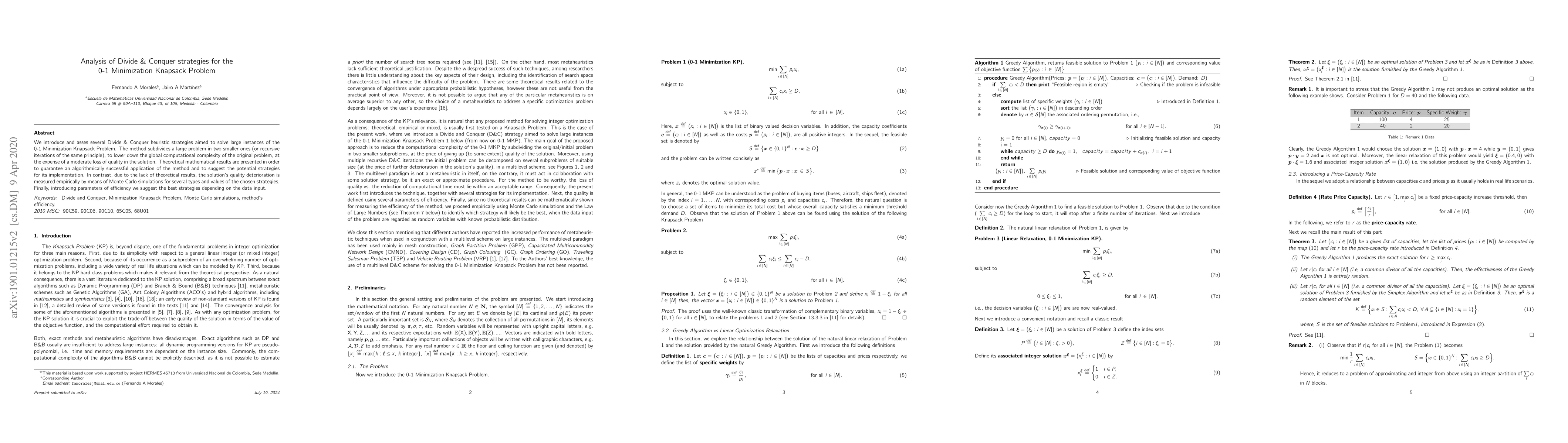 This paper proposes Divide & Conquer heuristic strategies to tackle large 0-1 Minimization Knapsack Problem instances, theoretically guaranteeing algorithmic success and empirically measuring solution quality degradation via Monte Carlo simulations. It suggests optimal strategies based on input data efficiency parameters.
