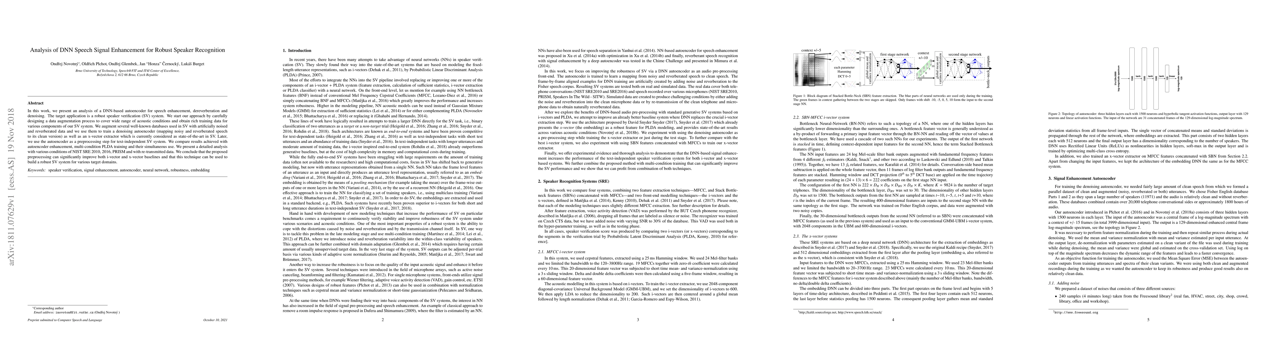 In this work, we present an analysis of a DNN-based autoencoder for speech enhancement, dereverberation and denoising. The target application is a robust speaker verification (SV) system. We start our approach by carefully designing a data augmentation process to cover wide range of acoustic conditions and obtain rich training data for various components of our SV system. We augment several well-known databases used in SV with artificially noised and reverberated data and we use them to train a denoising autoencoder (mapping noisy and reverberated speech to its clean version) as well as an x-vector extractor which is currently considered as state-of-the-art in SV. Later, we use the autoencoder as a preprocessing step for text-independent SV system. We compare results achieved with autoencoder enhancement, multi-condition PLDA training and their simultaneous use. We present a detailed analysis with various conditions of NIST SRE 2010, 2016, PRISM and with re-transmitted data. We conclude that the proposed preprocessing can significantly improve both i-vector and x-vector baselines and that this technique can be used to build a robust SV system for various target domains.