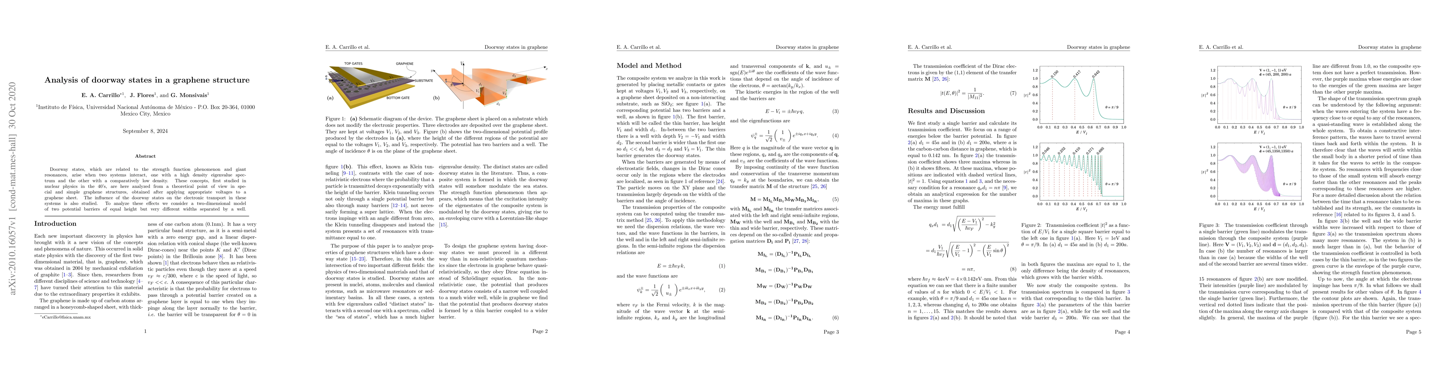 This paper theoretically investigates the doorway states in graphene structures, focusing on their impact on electronic transport. It employs a two-dimensional model with two potential barriers of different widths to explore these interactions and their relevance to giant resonances.