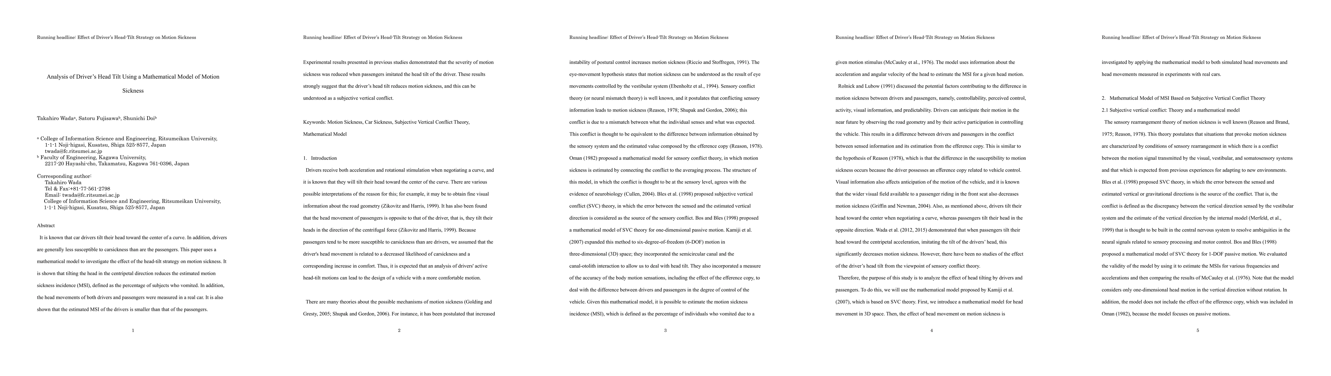 This paper investigates how drivers' head tilt towards the center of a curve reduces motion sickness using a mathematical model. Experimental results show that drivers experience less motion sickness than passengers, and imitating the driver's head tilt can reduce passengers' motion sickness severity.